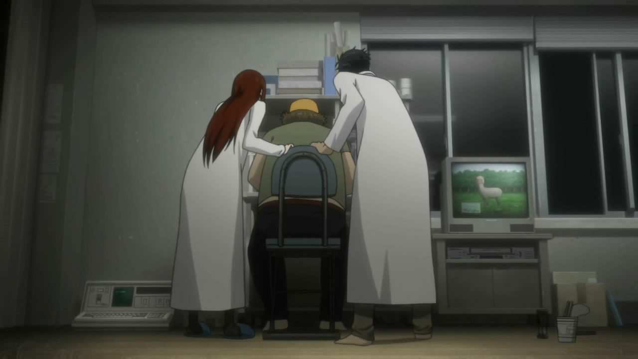 Things starting to get interesting.The sponge joke was funny: http://images.randomc.net/Steins%20Gate/Steins%20Gate%20-%2005%20-%20Large%2030.jpg