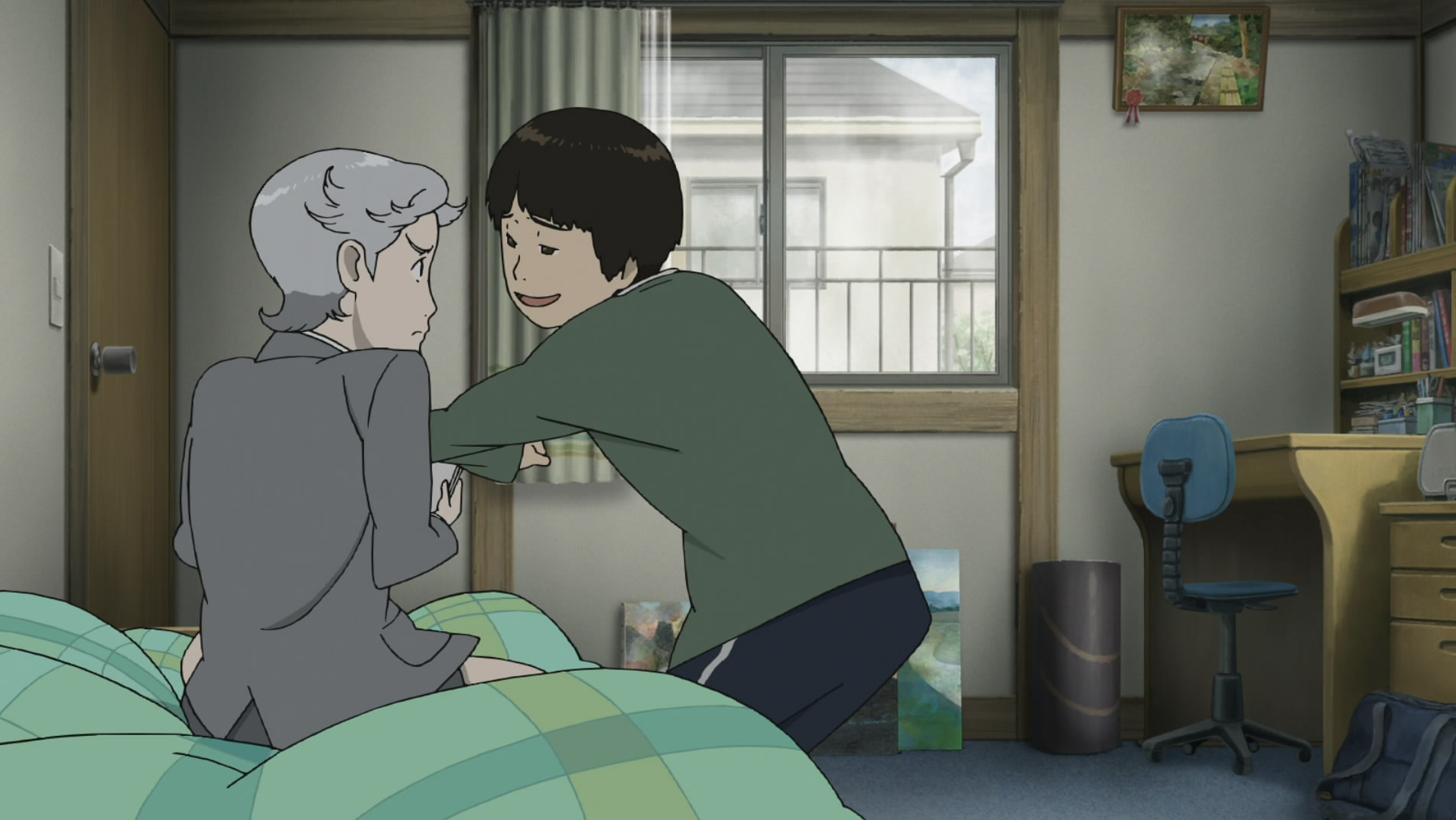 I won’t spoil the major plot twist that comes at the end of the film, just in case you haven’t seen it – but I will say that I guessed it fairly early on. Rather than lowering my esteem for the film, though, it bolsters it – because it feels natural and logical. Frankly, it’s how I would have written it if it had been my story. The basic premise is that a lost soul shows up in the afterlife, guilty of a sin it cannot recall. An odd little “angel” named Purapura – an impish schoolboy in a short-pants suit and tie – tells him he has a choice. He can go on a “homestay” – inhabit the body of a recently deceased human and try to remember his sin, atone and earn his way back into the reincarnation cycle. In this case, the human is a 14 year-old boy named Makoto who has just attempted suicide with his mother’s sleeping pills. Just as he expires in his hospital bed, the wayward soul enters his body and opens his eyes to a strange, unfamiliar world.