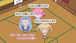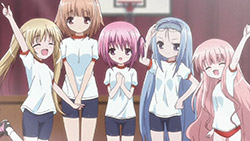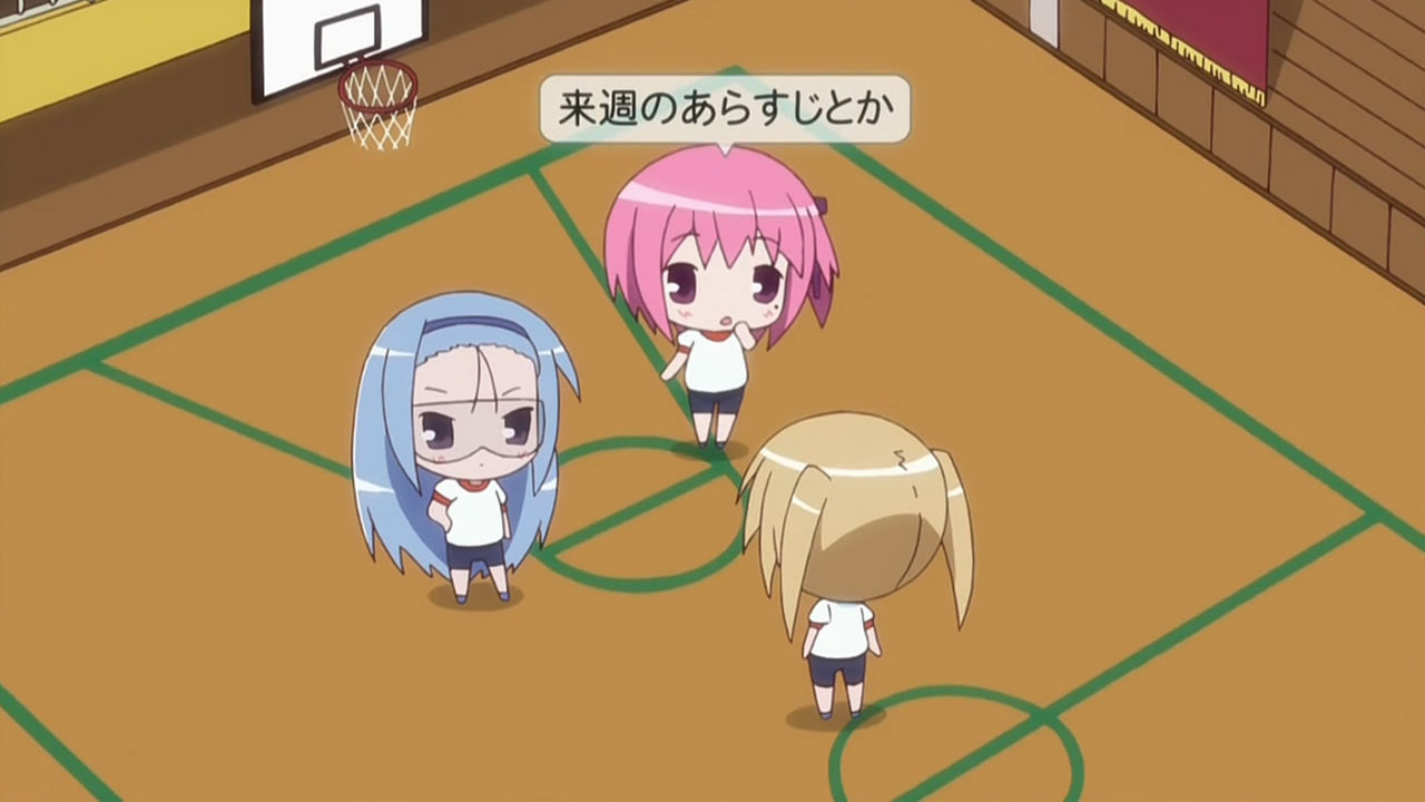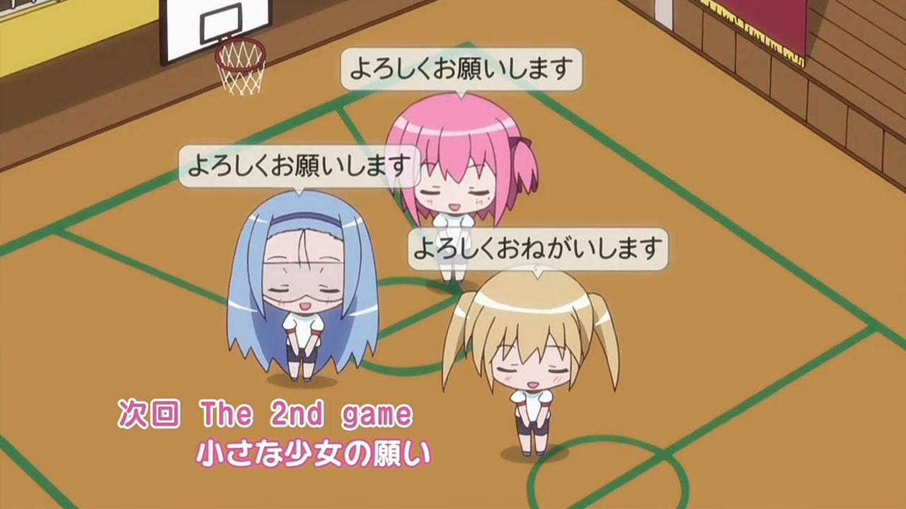 The thing of it is, though, that the execution isn’t half-bad. None of the three studios credited has ever been a lead studio on a series that I’m aware of, but director Kusakawa Keizou is a real veteran – he did the 2nd and 3rd seasons of Nanoha, the Nanoha movie, Sekirei and Dog Days among others. It’s a solid cast, headed by Kana. The pacing is peppy, the animation is bright and cheerful and the story could just be mildly interesting if they don’t totally give it over to fanservice and moe. There are a few funny moments in the episode, including a very clever bit where the girls converse online via chibi avatars on a tiny basketball court. The OP is rather bland, but I quite liked the peppy ED – although it does sound uncannily like the first OP from Minami-ke, “Keikenchi Jōshōchū”.
