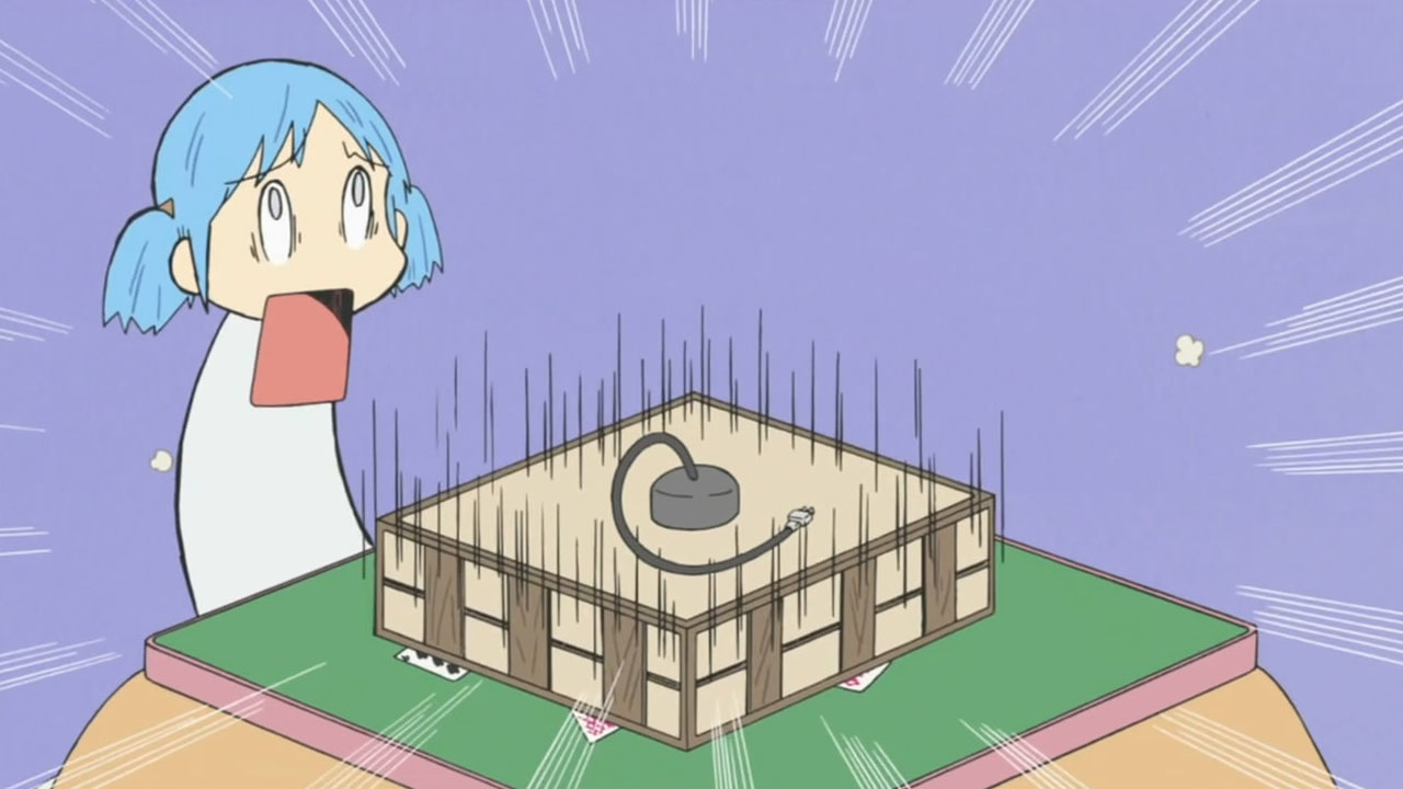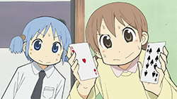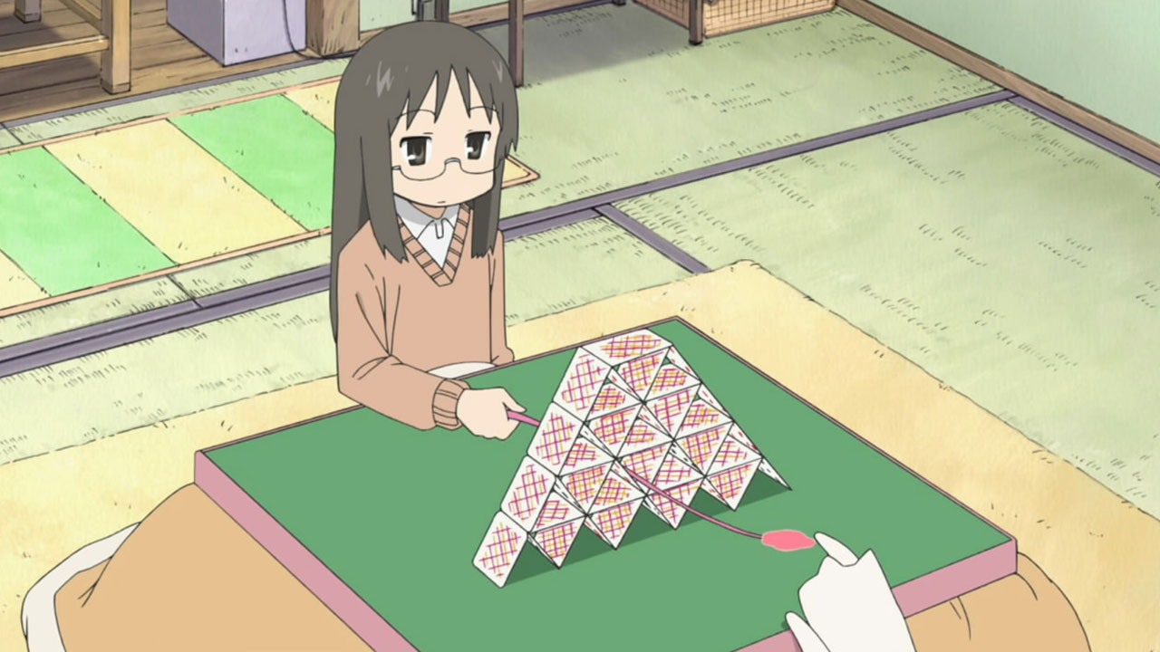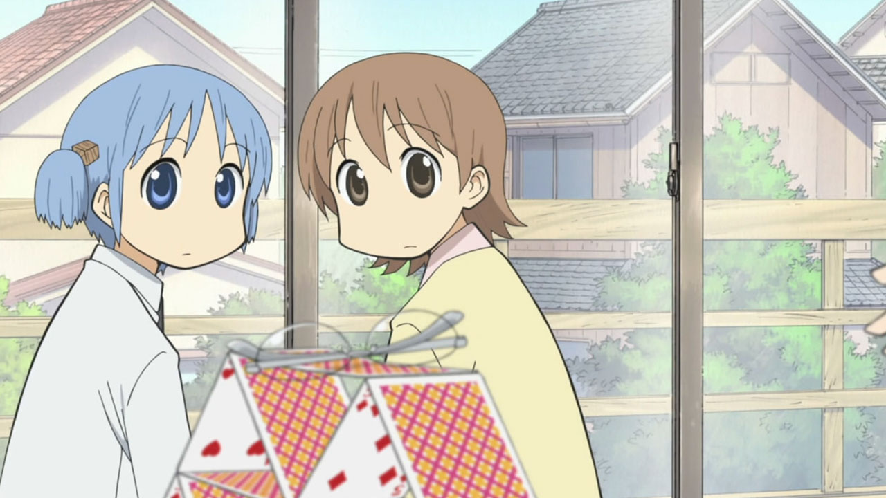 Simplistic animation creating an overwhelming effect. This is what defines Nichijou from the rest of the random-genre anime, if I say it in the technical aspect. But the exaggerated facial expressions are just too difficult to ignore. On another note, I really don’t have any idea about the Card Tower scene as to why it’s causing such a fuss on this side of the slope. I’ve never read the manga or watched the anime at this time. Looks like I’ll have to find out.
