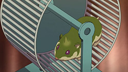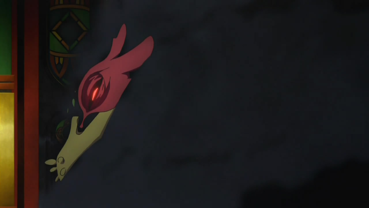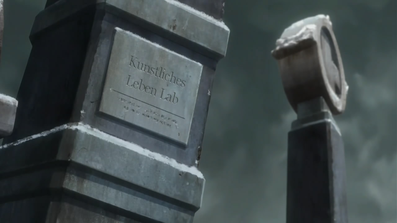 Less obvious but equally important – the questions of how Gale got into the Academy, and the meaning of the lab that Shura discovered on the other side of the portal. On the former, it’s strongly implied that Severus Snape Professor Igor Nehaus is the one who invited Gale in – we catch a glimpse of him when Shura discovers the gate inside the van, and Pheles pretty much states that the whole thing was an inside job. His motive was established way back in episode 7, so he’s clearly the prime suspect at this point. What about the “Kunstliches Leben Lab” Shura found in the middle of the arctic forest on the other side of the gate? An artificial life lab banned by the Vatican 300 years earlier? That certainly comes out of left field at this late stage of the game. Also interesting was the little hamster on Mephisto’s desk. A little green hamster. A little green hamster with a horn. Remind you of anyone? Hamster-kun gets not one, but two close-ups, too.