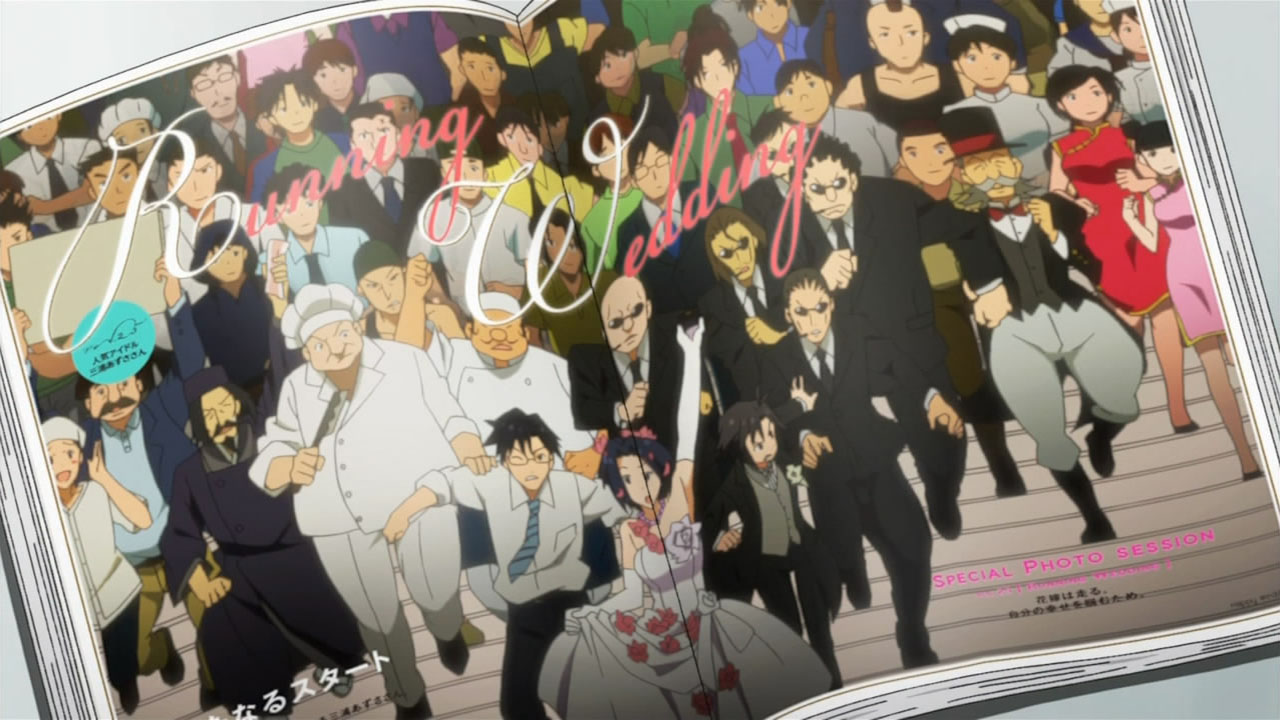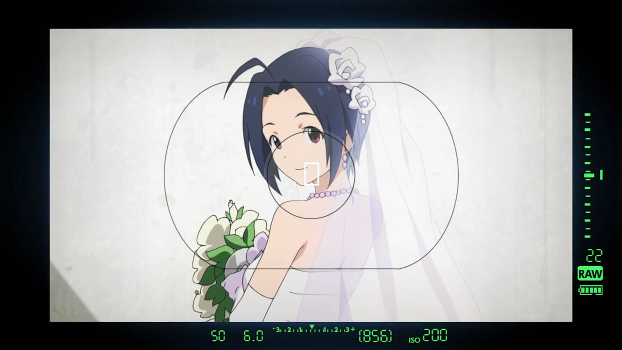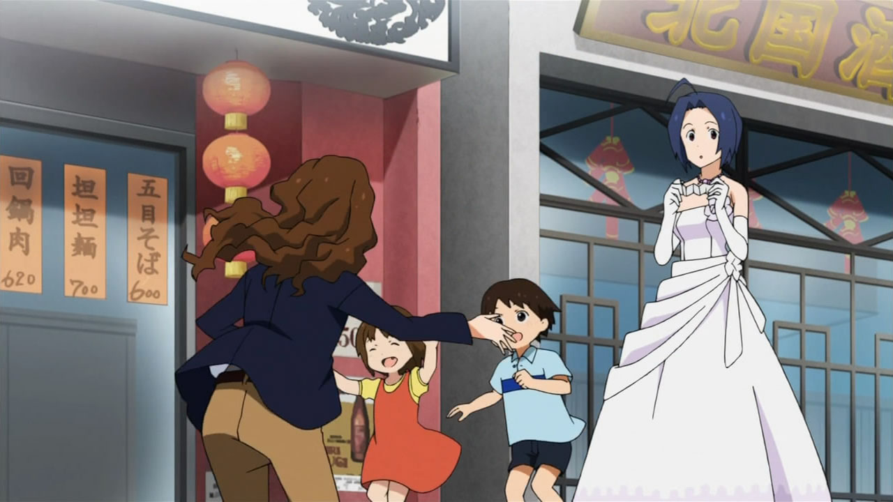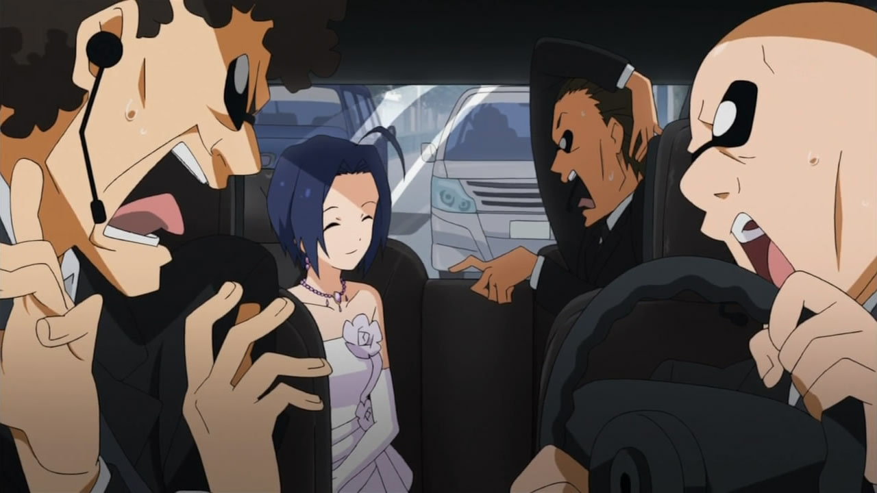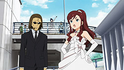Wedding dresses, wedding dresses, and more wedding dresses. The focus may have been a wild goose chase centering on the angelic Azusa, but I know who I had my eyes on. As usual, it only took a few moments in front of the camera for Miki to make her mark on an episode, which proved to be a nice bit of playful fan-service amidst the oil magnate’s (Onosaka Masaya) hunt for his reluctant bride to be (Shouji Umeka). I honesty didn’t think the entire episode would revolve around Azusa trying to get back to the chapel for the photo shoot and the Producer/Makoto chasing after her “kidnappers”, but after the second good deed by our wandering bride, it became pretty evident that they were going to take that formula and run with it. Not that I minded or anything, as Asuza’s slightly air-headed yet genuinely goodhearted nature is infectious. If the series is going to have an episode about Azusa making the world a better place by just being herself, I’d have to be a really jaded jackass to shun it for doing so.