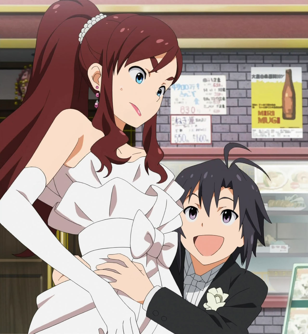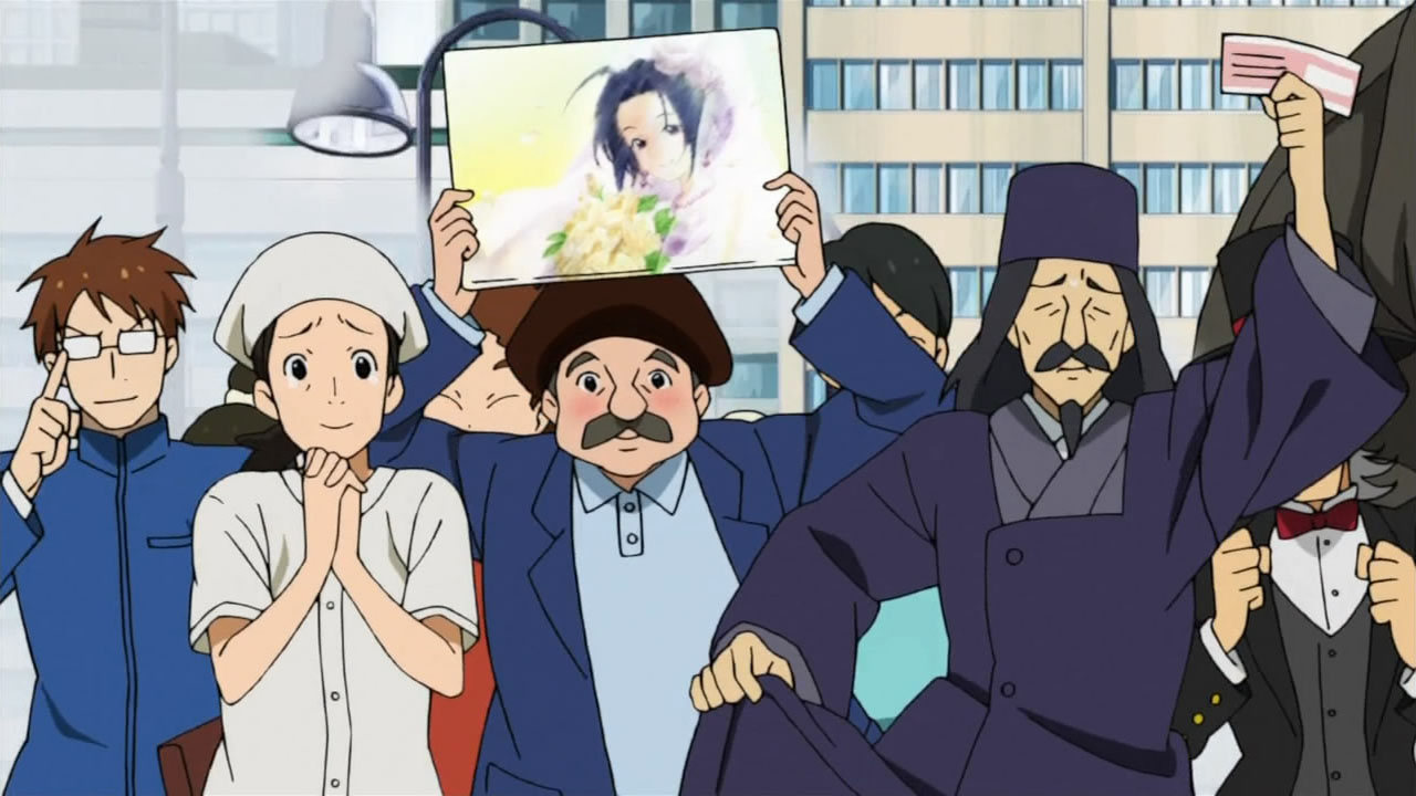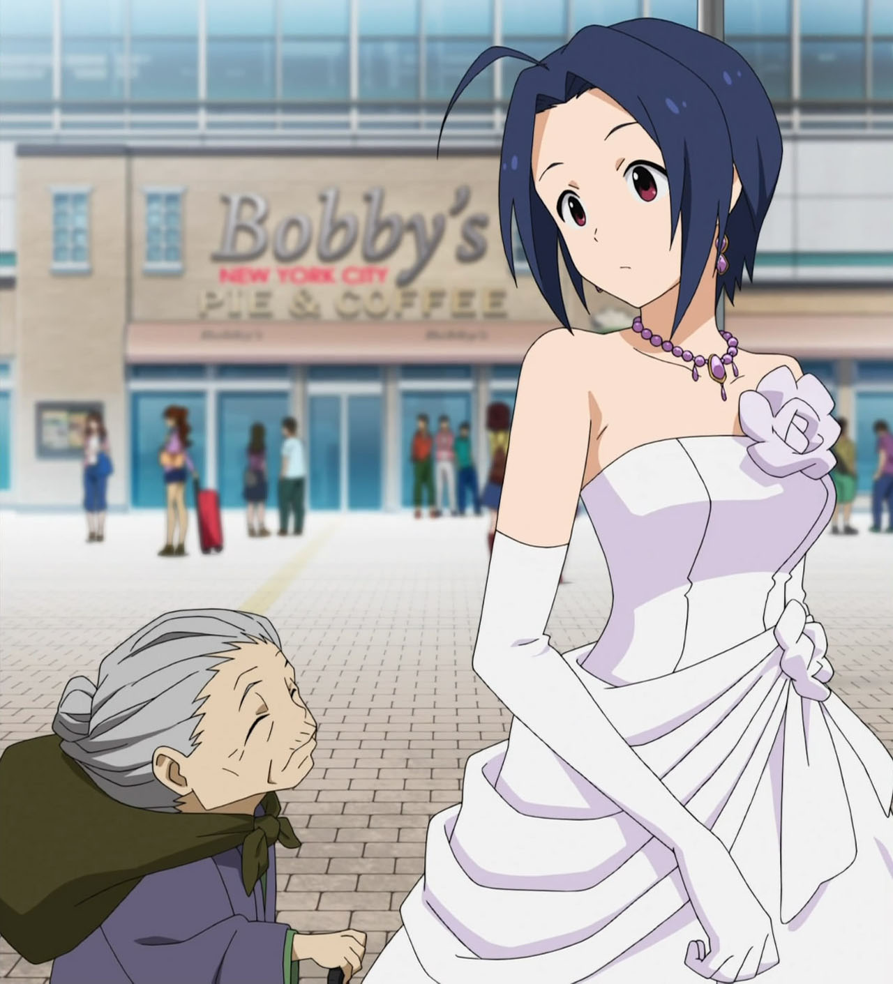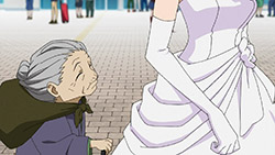Wedding dresses, wedding dresses, and more wedding dresses. The focus may have been a wild goose chase centering on the angelic Azusa, but I know who I had my eyes on. As usual, it only took a few moments in front of the camera for Miki to make her mark on an episode, which proved to be a nice bit of playful fan-service amidst the oil magnate’s (Onosaka Masaya) hunt for his reluctant bride to be (Shouji Umeka). I honesty didn’t think the entire episode would revolve around Azusa trying to get back to the chapel for the photo shoot and the Producer/Makoto chasing after her “kidnappers”, but after the second good deed by our wandering bride, it became pretty evident that they were going to take that formula and run with it. Not that I minded or anything, as Asuza’s slightly air-headed yet genuinely goodhearted nature is infectious. If the series is going to have an episode about Azusa making the world a better place by just being herself, I’d have to be a really jaded jackass to shun it for doing so.