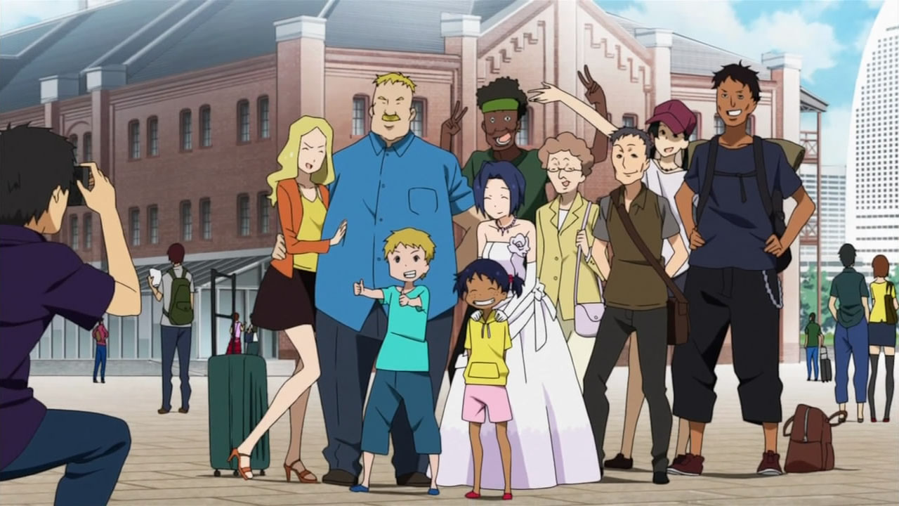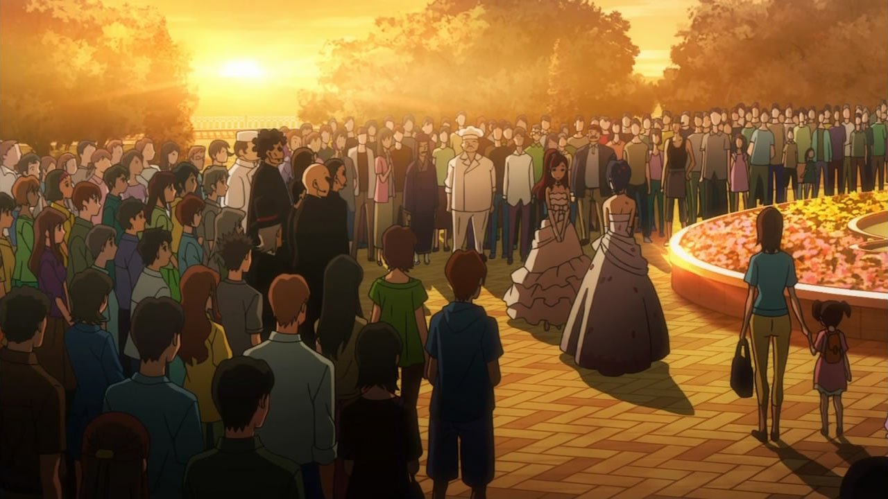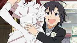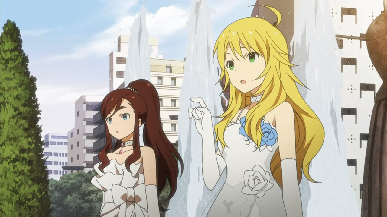 Like with most of the IM@S episodes before, there was never a real sense of urgency, yet the semi-resemblance of a plot worked well in further highlighting some of the girls’ appeal. Makoto was pretty awesome in that regard, getting stuck with the groom role and demonstrating her fighting ability in a surprisingly well-choreographed fight scene that popped up out of nowhere. In addition to promoting Makoto’s boyish charm, scenes like that make me even more appreciative of the animation that A-1 Pictures is churning out each and every episode. I also have to give credit to the oil magnate’s SPs, who quickly established themselves as serious yet goofy extras to maintain the lighthearted feel that I’ve come to expect from this series. The only thing I would’ve liked to see is some more screen time between Makoto and the nameless bride, after the latter showed some interest in our cross-dressing idol, but I realize that would’ve taken away from the huge wedding-like gathering when Azusa was finally able to return the ring. With the sunset in the background, it would’ve killed the mood if Makoto stole the spotlight away from the formal proposal.