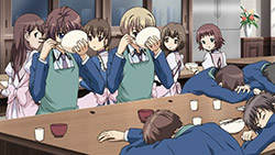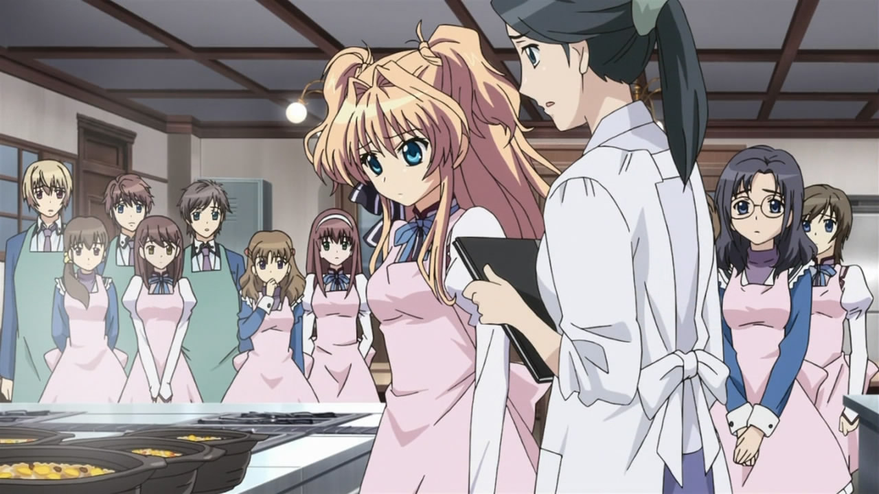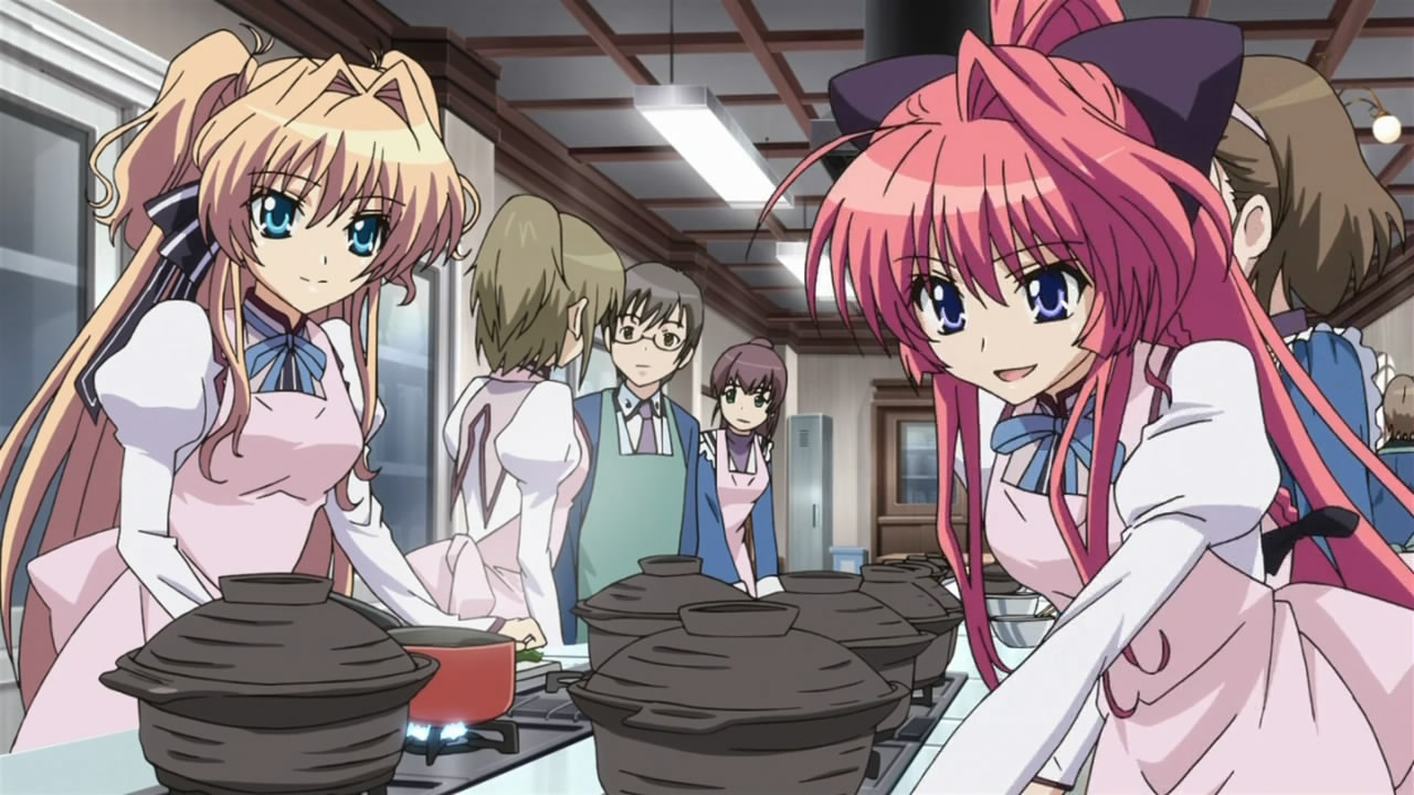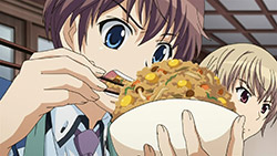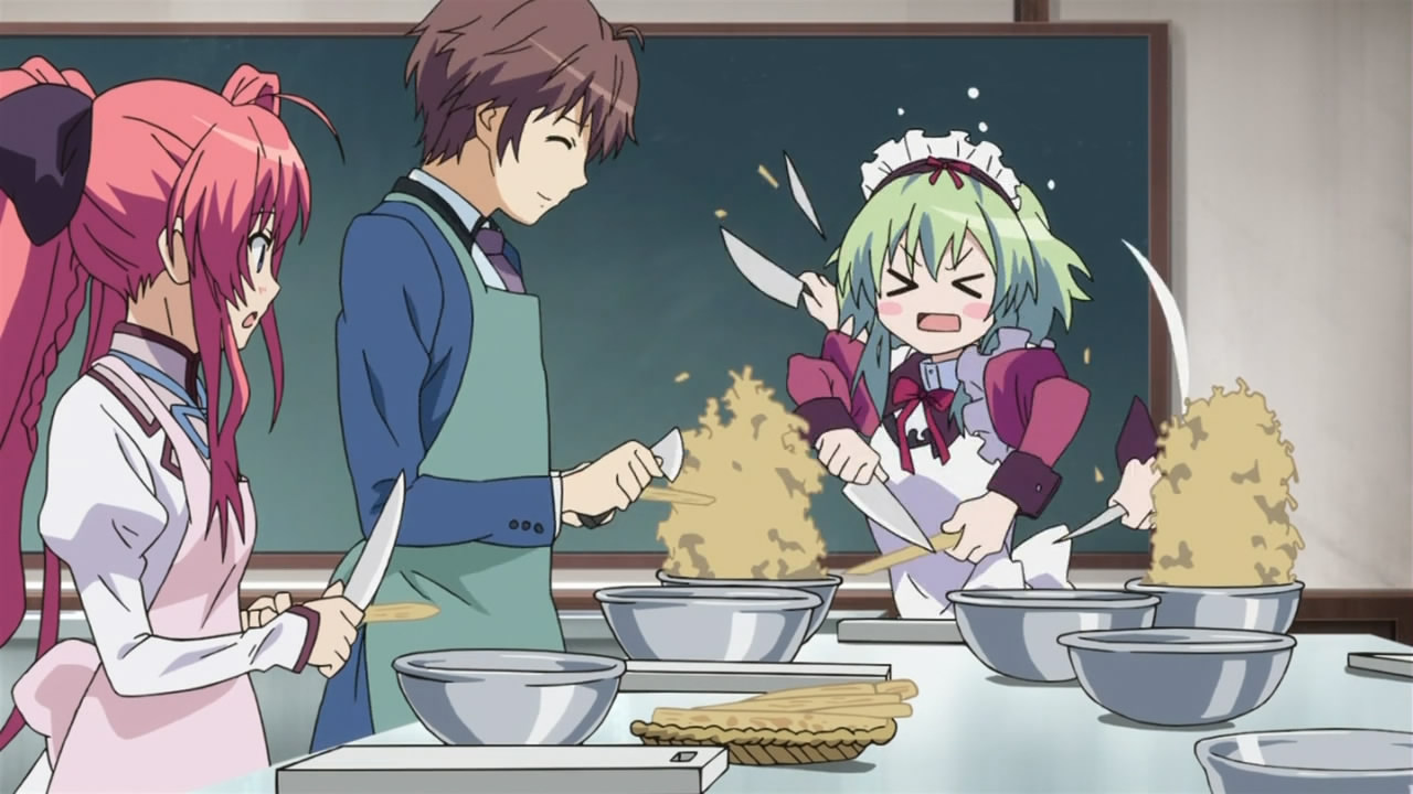 Now what amazes me is that I don’t particularly mind how the “laws of anime” are broken here. I don’t find it all that unbelievable that a diligent model student like Airi wouldn’t resort to violence. After all, she’s proven to be a lot stricter than her easygoing mother Ranka (and her psychotic Yuri-like laugh), plus her first meeting with Shingo was on very good terms. What’s more, Airi’s friends with Sakuno, who probably wouldn’t take well to any unnecessary abuse to her beloved stepbrother, and Kagamidai didn’t just send random students to Yuijo to poorly represent the school. (Hayata is the student council president for example.) Objectively speaking, there’s plenty of reason to believe that Airi wouldn’t lash out at every opportunity, yet at the same time, I’m completely astonished by the fact that she actually doesn’t. I’ve grown so accustomed to seeing how those scenarios play out (read: brainwashed) that it’s downright strange when they turn out rather normally. The same goes for the “special curriculum” cooking class, where all the guys were helpful with both preparing the chestnut rice and eating all the excess that Ange made so that their class wouldn’t get in trouble. It’s all so civil — TOO civil.