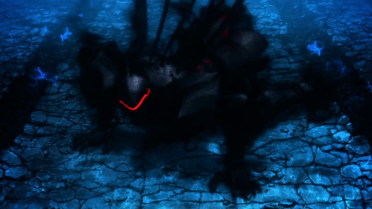 Now is it just me or does Berserker (Okiayu Ryoutarou) look pretty amazing? Ufotable’s really outdone themselves animating him (with what I imagine is CG), especially the black fog that helps mask his true identity. For the inquisitive minds out there, his fog is known as “For Someone’s Glory”, presumably one of his Noble Phantasms, the other of which allows him to create a makeshift Noble Phantasm out of other objects like he demonstrated here. Interestingly enough, the offensive ability is known as “Knight of Honor” or in its literal translation, “A Knight Does Not Die Empty-handed” 「騎士は徒手にて死せず」, in reference to how he doesn’t seem to carry a weapon. In any case, Berserker sure made an impact with his sudden arrival, shrouded in mystery and fending off Archer’s “Gate of Babylon” Noble Phantasm like it was nothing. While his true identity may have been inadvertently spoiled for a lot of readers (no, not by me), there have been enough hints from the show itself to make viewers suspect as much. We have the ending sequence shot, plus Berserker losing control once he set his eyes on Saber. It does however raise questions about what effect Berserker and Saber’s repeated encounters are going to have on Kariya. From the look of things, it’s taking quite a toll on him to keep Berserker under his control, as Zouken’s bugs eat through his body even faster.