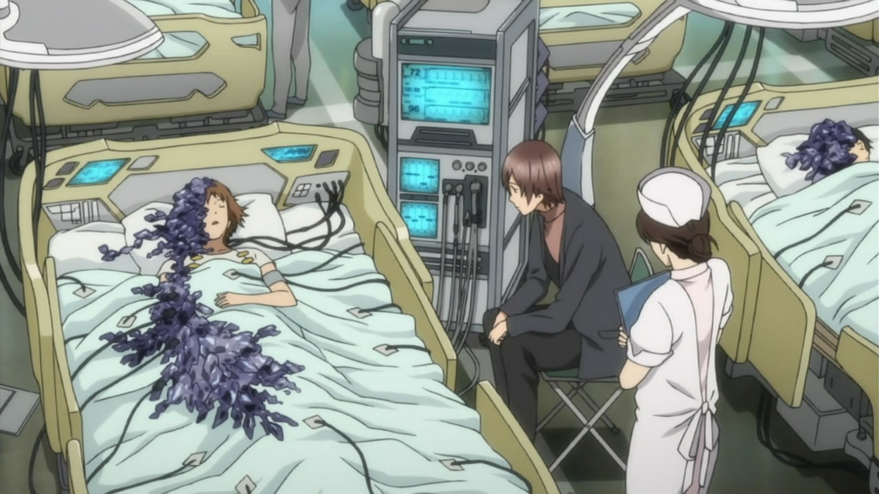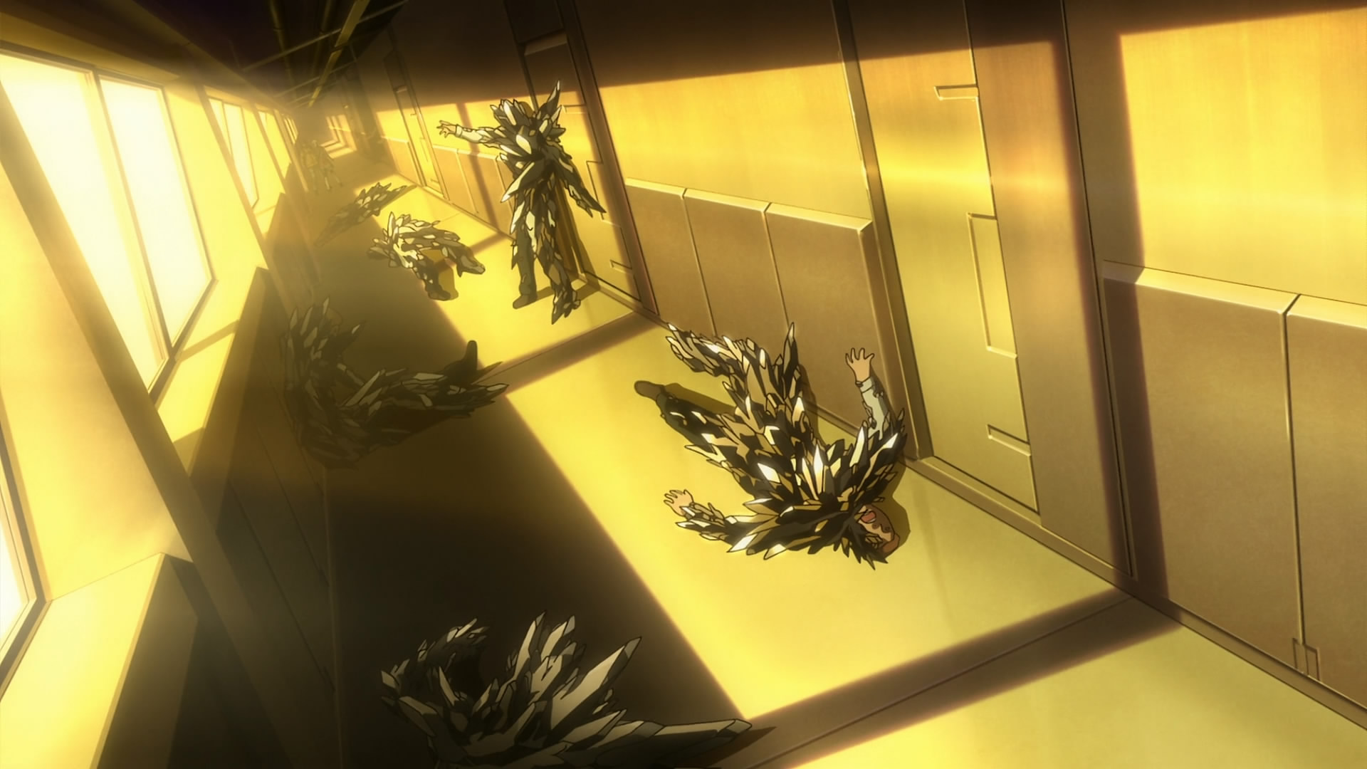 Of course, that’s not to say our main trio of Shuu, Gai, and Inori took a backseat this week. As per the above, Shuu’s decision to follow Gai with Segai’s transmitter in hand suggests that he still doesn’t trust Funeral Parlor and is primarily tagging along because of Inori (…good reason IMO). It also foreshadows the possibility that Shuu will betray Gai and come to regret it, which would help our protagonist ultimately decide on which side to support. More often than not, I find this type of development irksome to watch, but there’s almost always a positive effect on an indecisive character who goes through it, plus the air of distrust floating about should make things more interesting to watch. In Shuu’s case, we also have the subplot about what I presume to be losing someone dear to him, which the crystallization effect caused by the Apocalypse Virus sort of reaffirmed here.