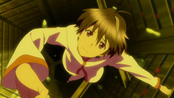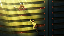 That scene reminded me of Deadman Wonderland when they were fighting on the fall-away floor and a simple roll on the floor took him dozens of feet away. Very trippy.
