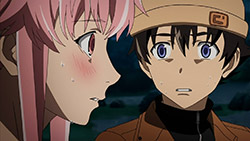 On balance, I’d say Director Hosoda and Writer Takayama nailed this arc’s conclusion – it was as close to perfect as I could have hoped for. The pacing was as breathless and exciting as I remember from the manga, the sheer brutality of events both past and present wasn’t glossed over, and the ludicrous depth of Twelfth’s craziness was brought to life in all its glory. There’s more than one speed to Mirai Nikki, as bombastic as it is, and the evidence points towards the production team having a handle on both the frenetic and more relaxed sides of the series. It looks to me as if the adaptation is just behind the pace it will need to be to adapt everything in 26 eps, so there might be some corners cut or speeding up of events down the line – but they’re not far behind, so I don’t think it will be insurmountable. I’m just thrilled to have two cours and thus to avoid another Deadman Wonderland disappointment, and even more to have an anime that so effectively captures the spirit of one of the best mainstream manga of the last decade.