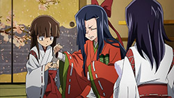 It was a big episode for Yukkii, too. He’s finally come to realize that Yuno is the perfect girl, except for that one nagging flaw – she’s a stalker and her house is full of bodies. I feel you, Little Brother – haven’t we all been there? Of course Yuno was exactly right about Sixth trying to trick him, and of course he had to spend some time cowering under the shrine to gather his thoughts and have a good cry. But in the end, when Sixth was trying to inflict on Second what had been done to her, First came to her rescue rather than let her be defiled. Not only that, it was his wits that managed to turn the tables on Sixth by using her mother’s hand ball and the dart of doom (fortunately Yukkii has a pocket full of those). Baby steps, I know – but a corner has been turned and while Yukiteru may be a virgin, he’s no longer an innocent (and I’m not talking swapping spit with Sixth).