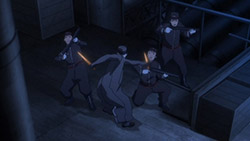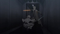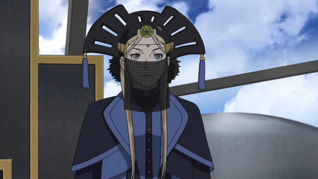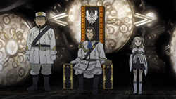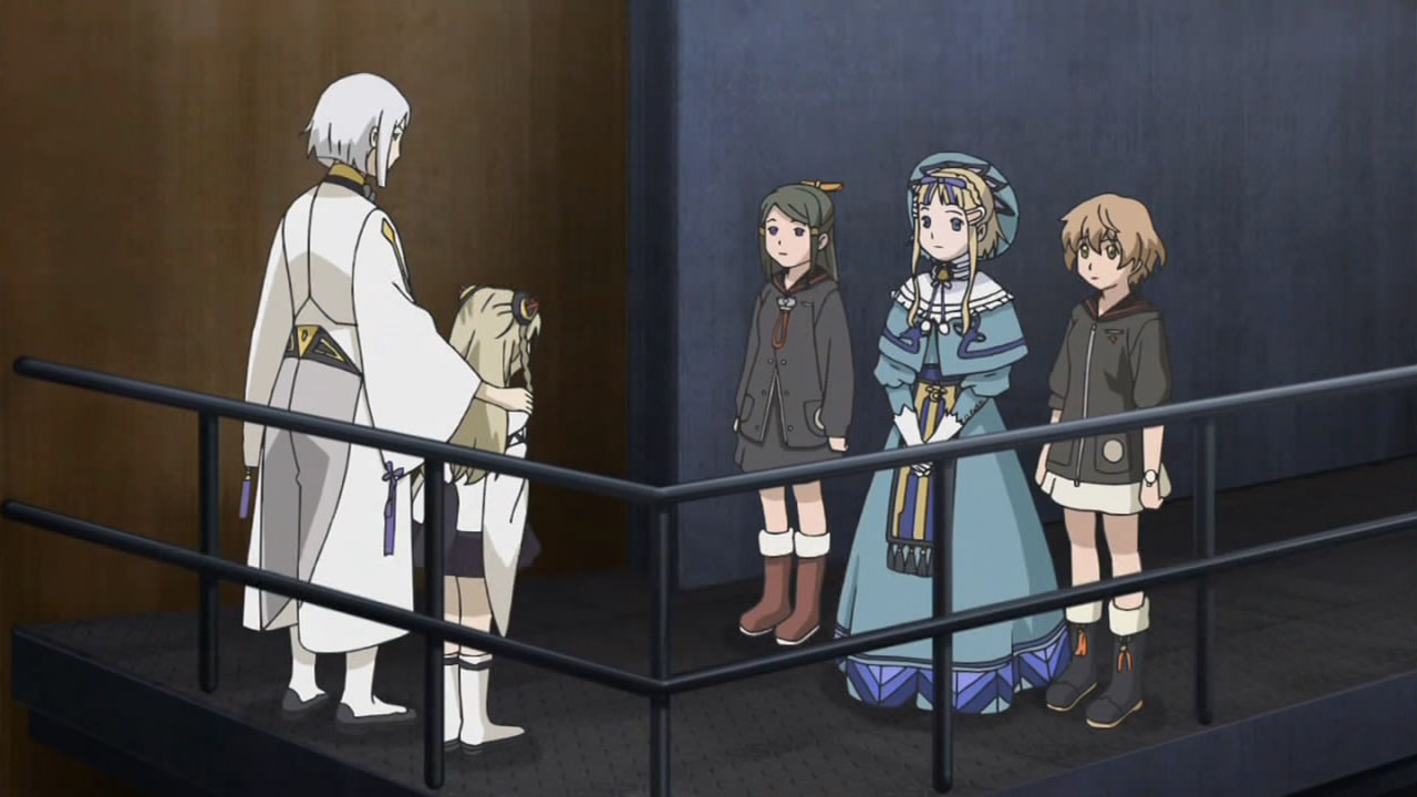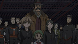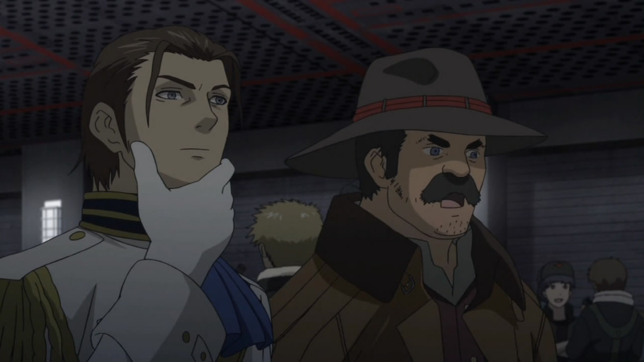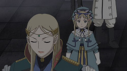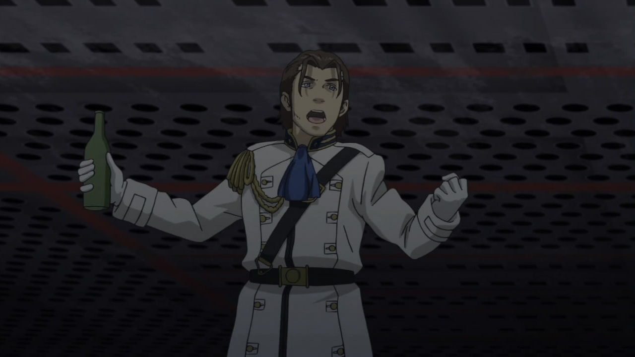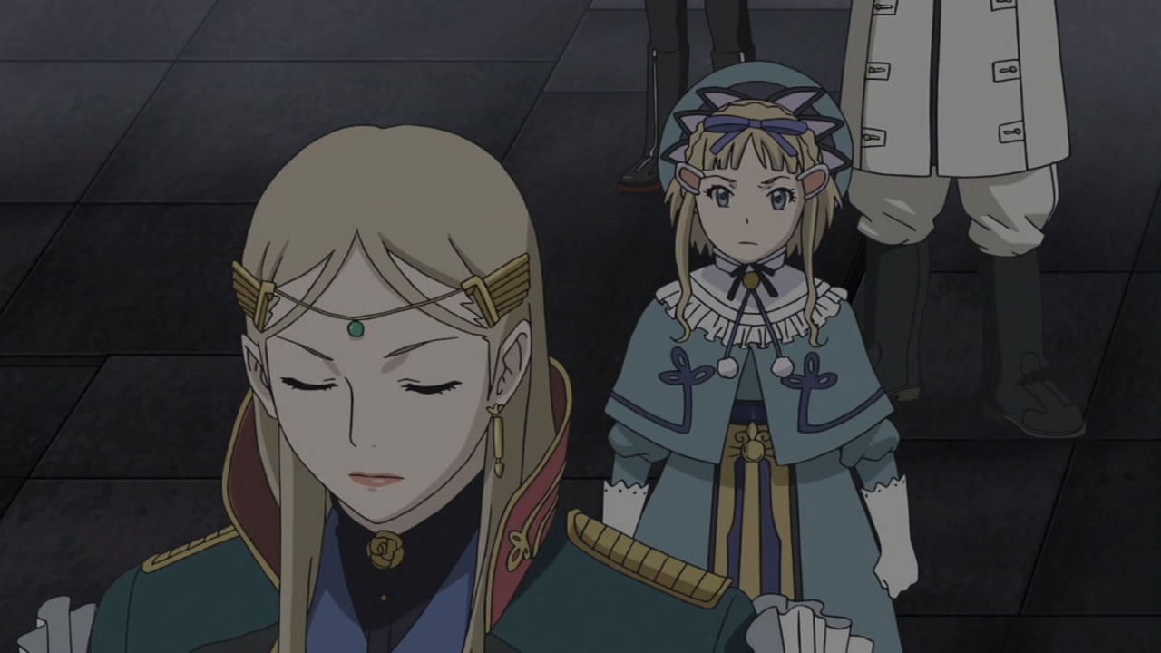 I’m not crazy about the re-casting of Alvis E. Hamilton with Kana Hanazawa, though a new seiyuu may have been inevitable since the original, Shiraki Anna (who was only 13 at the time of the series) hasn’t done any voice work since. Still, using KanaHana hints at the kind of otaku pandering that has infiltrated the series in many ways. She’s certainly a capable actress and I’m sure she’ll do fine, but it still feels a bit off to me. Be that as it may, it was nice to see Al again, though I’m not crazy about her new outfit. She should be about 13 now, and she appears in the company of Dio, who introduces her to the others as a controller of “The Anatoray Exile”. The implications are clear, and if there were any doubt the fact that she was the one thing Vincent fled the Sylvius with later in the episode – tucked under the arm like a loaf of bread – proves she’s of massive important to the future plans of the Alliance.