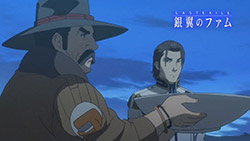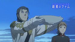 It was nice to see Vincent given a meaty role to play, bringing some legendary Urbanus coffee to the feast to celebrate the official union between Anatoray-Disith and Turan (though the younger set didn’t seem to care much for the “adult taste"”). Alas this party was crashed by the Ades Fleet, headed by no less than Luscinia himself. But it was his passenger that made the biggest impression – no less than Princess Lilliana herself. She appears to torpedo all of Millia’s efforts by announcing an alliance with Luscinia (and later even orders her flagship to fire on the Sylvius with her sister on board). Something is obviously off here, though just what – brainwashing, body-switching, hidden motives – isn’t clear at all. With the remaining Turan soldiers willing to take orders from Lilliana – who is their rightful leader after all – The Sylvius is under attack, and all those ships Fam and Gisey scrounged up as well. But at least Millia resists the temptation to go along with her sister’s plans, so in addition to having its land stolen Turan now appears to be in a state of civil war as well.