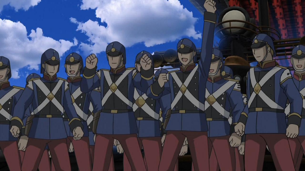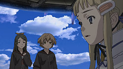 After last week’s recap episode, I continue to be a bit nervous about Gonzo’s financial wherewithal to finish this series in high style. The cel animation was quite a bit off this week – character faces lost a lot of detail and accuracy, not just in background but even in a few close-ups as well. The CG looked a bit less fluid as well. Dio’s light sabre duel with Alauda looked very good, but the rest of the ep not so much. If it were another studio I wouldn’t worry so much about a little normal fluctuation, but it isn’t another studio – and Last Exile is a series that’s pretty dependent on visual impressions to create its magic.