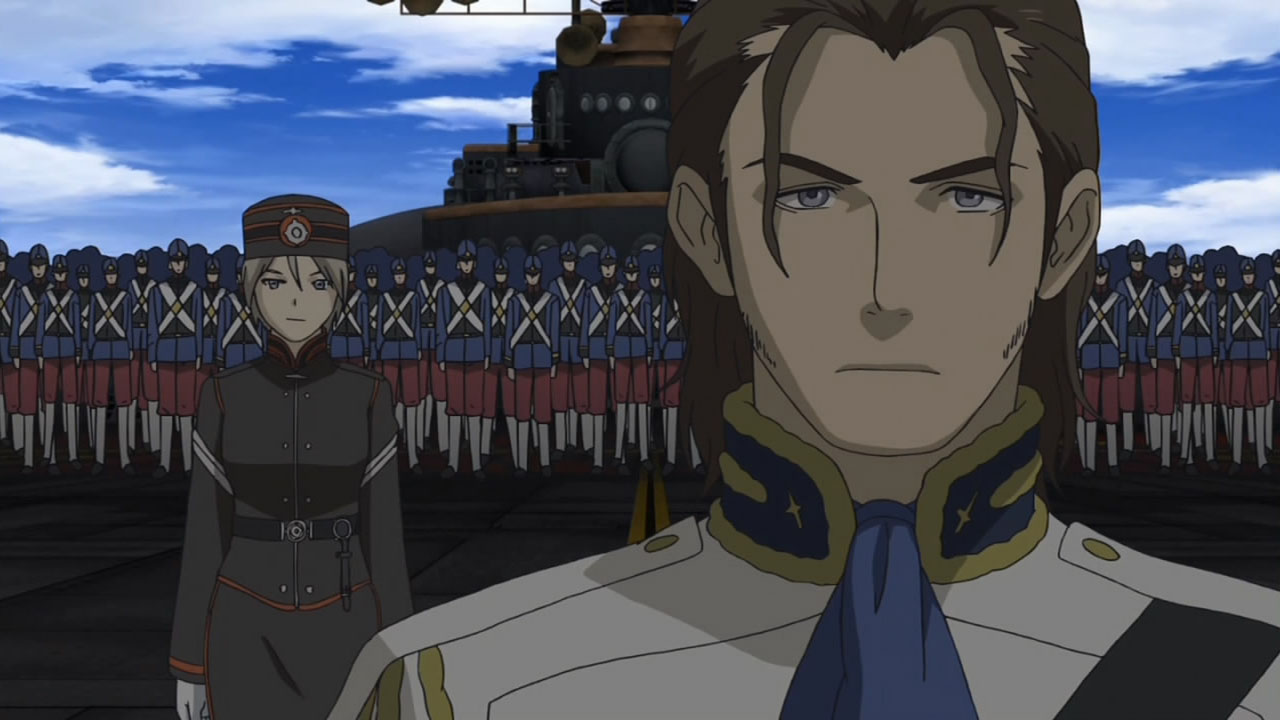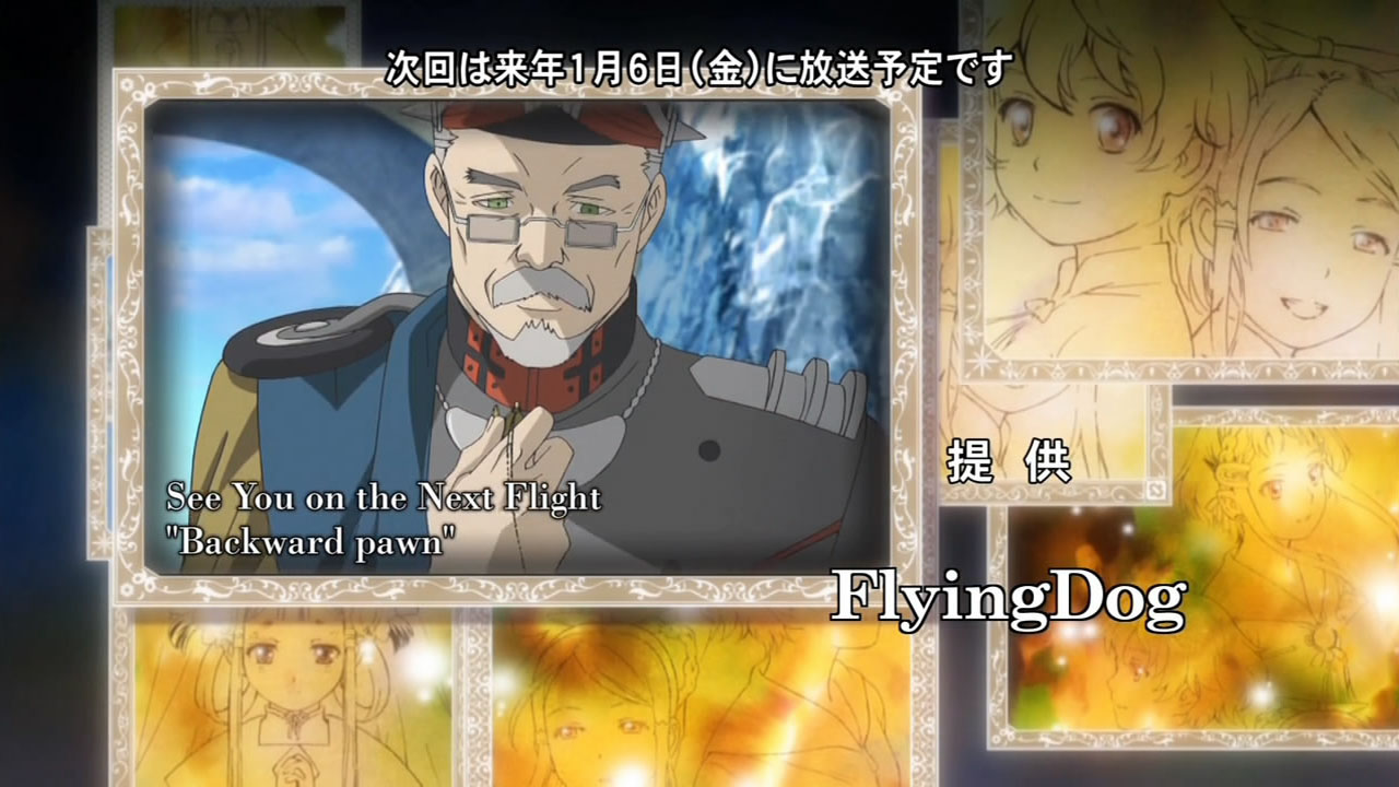 To counterpoint, it’s not perfect (nothing is) but in my opinion Gonzo’s doing a great job with this. The overall story is great and the characters are likeable and the mysteries and politics have been very intriguing and they’ve captured the awesome and unique look, feel and atmosphere of Last Exile again, and anytime (which is most of the time) the ships are flying or we get cockpit shots or sky-based shots or fleet battles they have been extremely exciting and involving and the visuals for them are gorgeous and the stunning backgrounds are the best of the season by far, easily my favorite show of the season already and these types of large scale action shows usually get even better in the second half when they can finally let loose with the bigger storylines, revelations, and action and character moments.