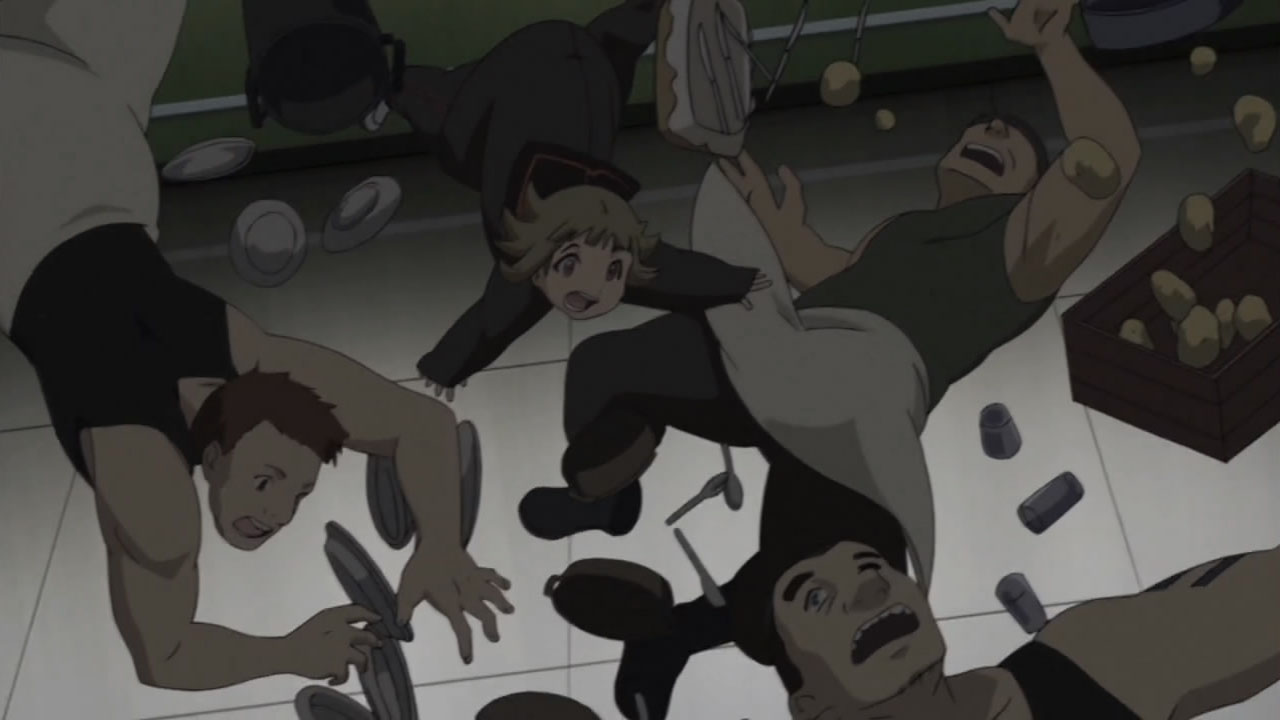 And despite this being their first show back and as such still in the process of rebuilding their “warchest” for affording consistent production values, even with the occasionally dip they’ve got the best and most inspired visuals of the season outside of Guilty Crown’s character animation (which is Prod. I.G at the height of their stability as a studio with a super-high budget and yet still not as visually interesting, exciting or at times breathtaking as Last Exile: GnF IMO despite IG’s high budget gorgeous character animation for GC.).