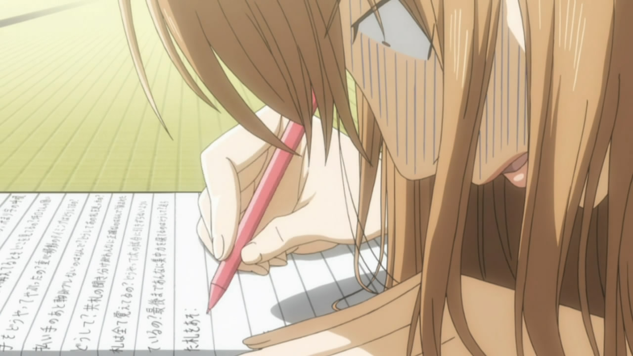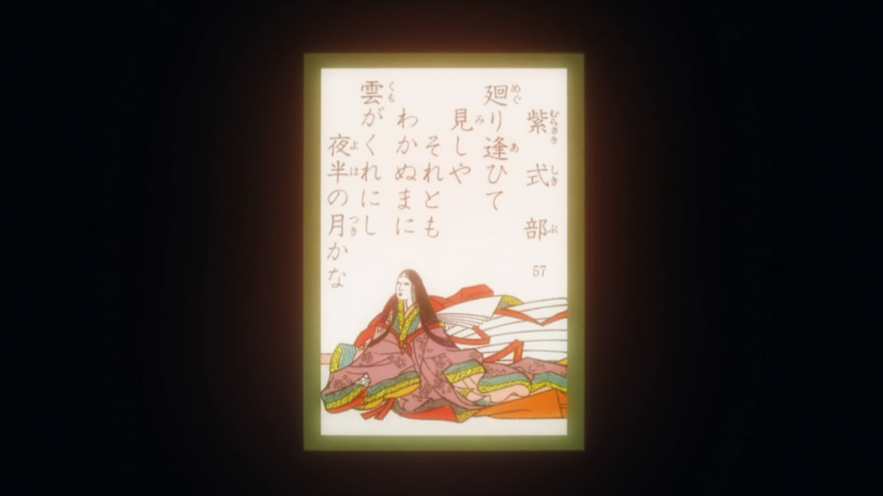 The mangaka certainly isn’t doing us any favors in terms of mixed messages. Kana drags Chihaya home to study, and on the way she reads a poem from The Tale of Genji which she states “sounds like a love poem, but is actually about a childhood friend – it sounds just like Arata”. If there’s a theme overriding the episode it’s personal responsibility, and Tsutomu sums it up by quietly scolding Chihaya when she returns – “You have to do the things you don’t want to do before you can do the things you truly want to do.” The words hit home in context – Taichi is the example Tsutomu uses, for the way he works hard at Karuta and manages to rank at the top of his class in grades anyway – and Chihaya takes the message and promises to do what she needs to do not to be held back a grade.