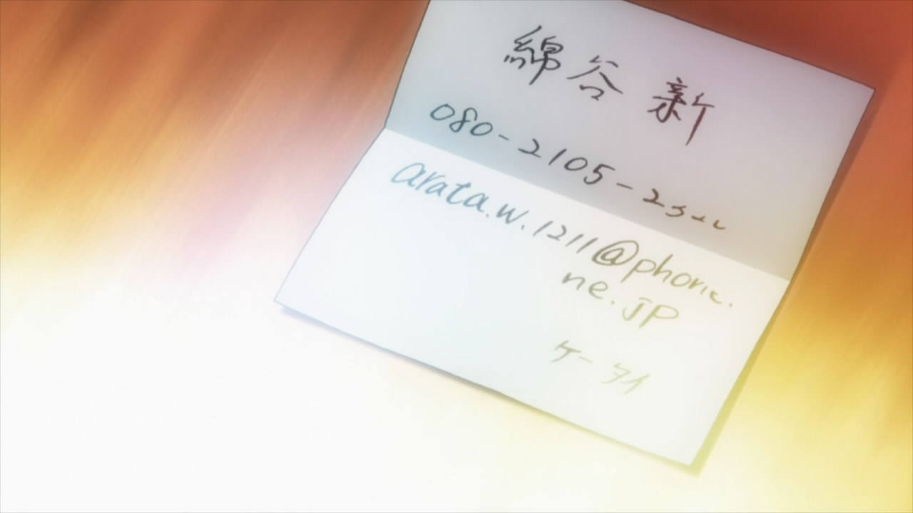 The phone number she has is for his home phone and the e-mail is just his personal e-mail. The number and e-mail he was giving to Taichi was for his cell which she does not have. In fact that was actually one of the personal notes/reminders she made for herself to get back in episode 5 if I recall correctly. Since she left those notes behind I’m pretty sure he’s been giving it a lot of time to read them over and think about it.