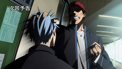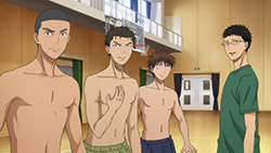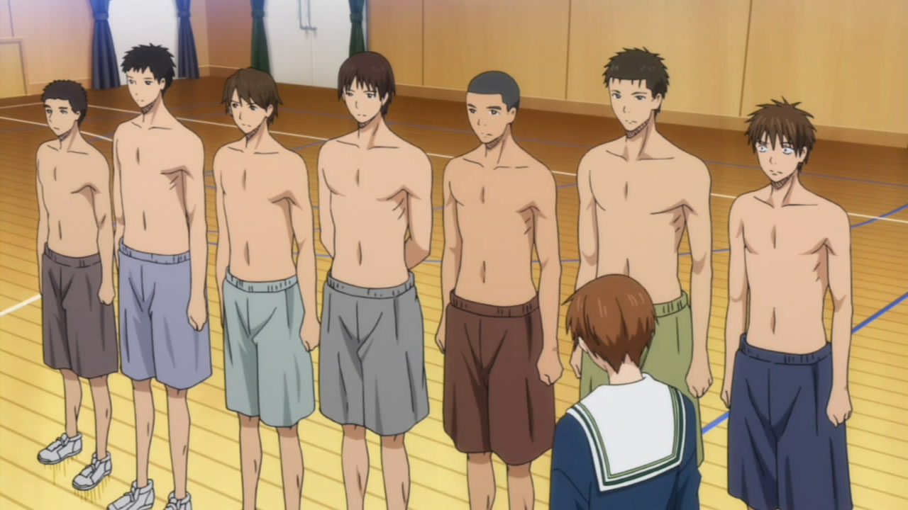 Most of the fun here, I think, is going to come from seeing Kuroko attack the game of basketball from such a skewed and unusual perspective. There’s also an eccentric cast of supporting players, about whom we don’t learn too much yet. The team is coached by young Aida Riko (Saito Chiwa), daughter of a fitness trainer, who takes the measure of the boys on her team (and freaks out the newbies) by scoping them out shirtless (Kagami is off the charts, Kuroko barely registers). The captain is Hyuuga Junpei (Hosoya Yoshimasa, actually playing another character who looks a lot like Arata) who seems like a classic hard-nosed overachiever. The rest of the squad (some second-years, some rookies) are basically bit players in the premiere but they’ll have their moments, and there are some name seiyuus in the group.