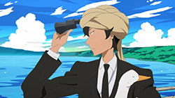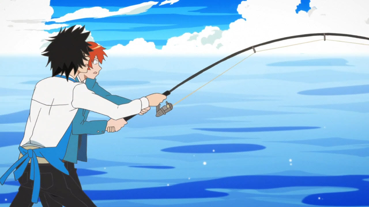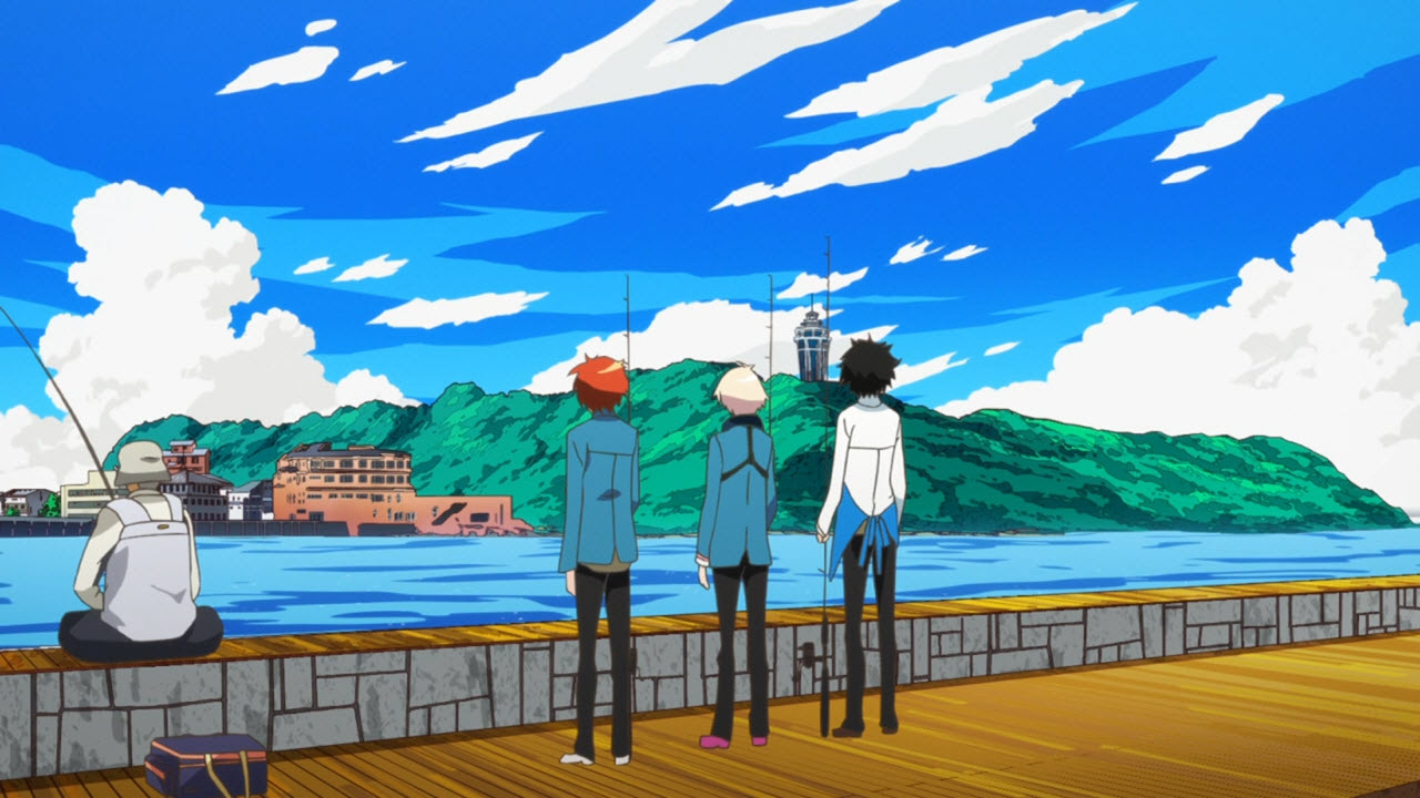 Enter transfer student Sanada Yuki (Ohsaka Ryota), a schizophrenic high school boy who for of yet-to-be-known reasons, moves around Japan frequently with his hipster grandma Kate (Hirano Fumi). His latest move brings him to the island of EndoshimaEnoshima, where he meets Haru (Irino Miyu), an eccentric boy/classmate/friend who believes himself to be an extraterrestrial and can apparently talk to fishes. Oh, and then he moves in with Yuki that very same day. Observing the self-proclaimed alien from afar is the duck-carrying Indian Akira Agarkar Yamada (Sugita Tomokazu) with his posse of the Men In Black. And to top off the quartet in this anime with boys fishing, what better but a professional fishing prince in Natsuki Usami (Uchiyama Kouki)? Here comes the real kicker: Through the powers of friendship, bromance and fishing combined, these four will somehow save the world. From what…? That’s anybody’s guess, really.