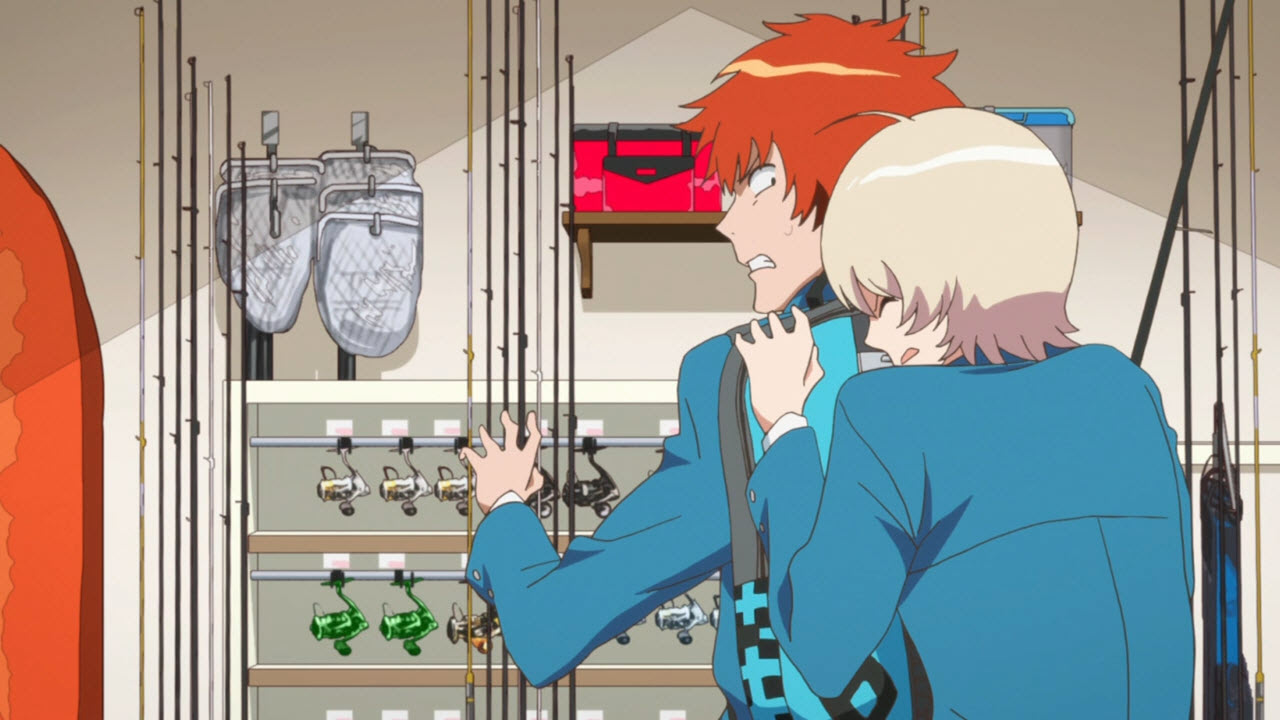 Like the short summary implies, the first episode of Tsuritama sets up one of the most oddly unique premise for a story that I’ve seen in a long time, populating it with a cast of characters that feels wholly original and refreshingly different despite drawing from common tropes of anime. Take Yuki’s unassertive nature along with his tendency to breakdown under stress; we see characters like this in almost every other anime (Case in point: Haruyuki of Accel World from this season), but his personality is illustrated through amazingly ordinary exchanges that feels immediately familiar and relatable, especially if you’ve been in similar circumstances, which was the case for me. (Crowd nerves, debating to give up seat on a packed train.) His antics are further played to comical results with his schizophrenia that comes in the form of an impressively animated drowning sequence, giving an overused trope a bizarrely entertaining twist that even ties into the overarching aquatic theme.