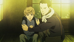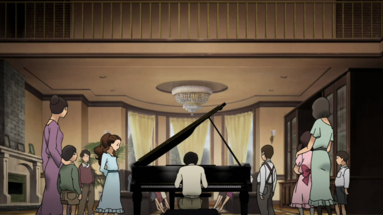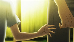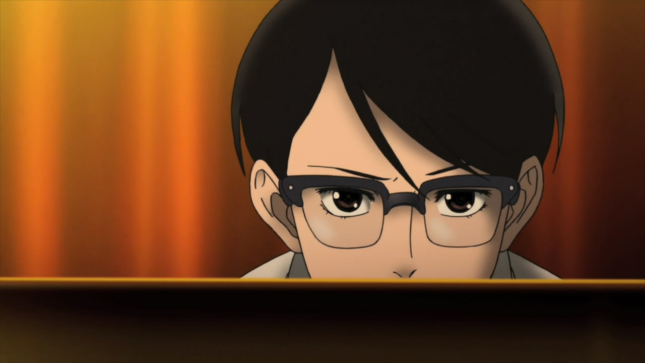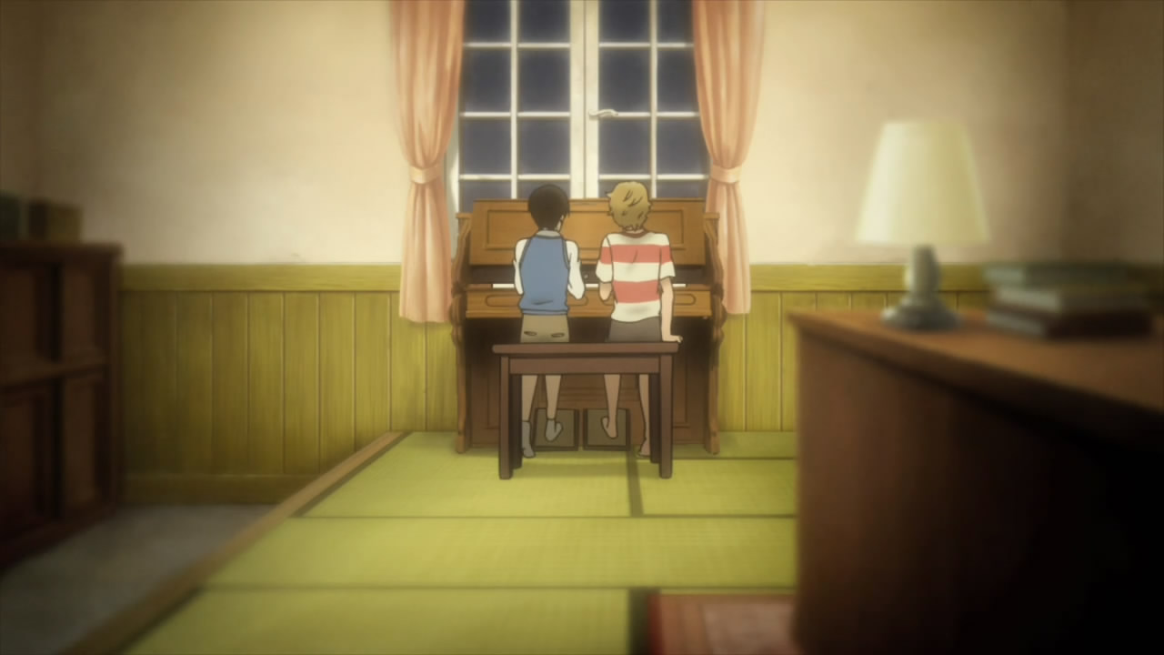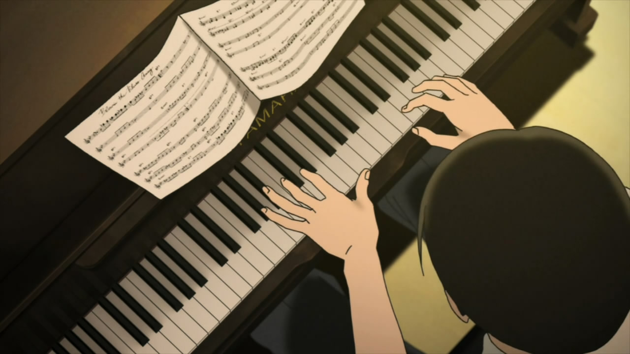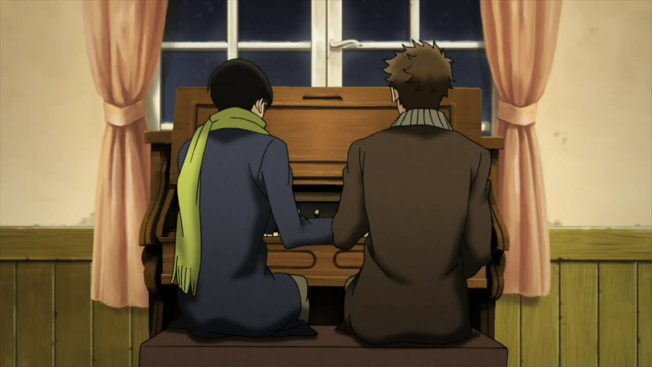 What Watanabe lacks in time, he makes up for in artistic flourish a small moment that takes a few seconds can be forgotten, but he gives us imagery that makes them profound and memorable. Take for example the moment that Kaoru kisses Ritsuko for the first time, surely a significant moment in its own right but one weve seen many times in anime. But by the simple act of having Kaoru take off his glasses before he kisses her, he makes it special, because so much meaning can be inferred from that simple gesture. I see it as a subtle way for Kaoru to gather his courage, the blur what was in front of him and make it less terrifying. Sentarous grim past is a huge part of the story, but what Ill remember from that sequence are two images the child Sentarou reaching for his step-fathers hand, just as the man pulls it away. And Sentarou and Kaoru playing the into to Moanin at the organ, not as the young men they are but as the kids who never knew each other. its a moment of fantasy, but it enlightens the reality of who they are and what the music means to them.