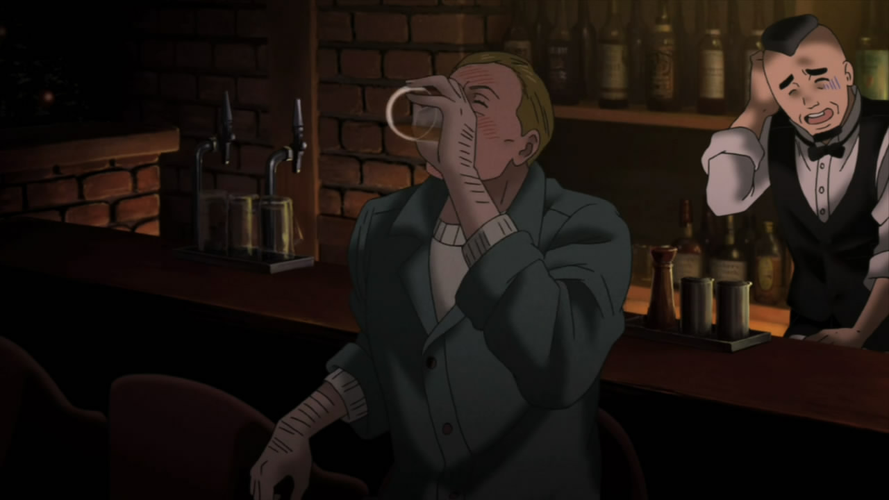 In closing, this episode was quite a feast if youre a jazz fan. From the moment I saw the Chet Baker Sings album in the background I knew wed get to If Not for Me sooner or later, and it happened at the Gaijin Club where the Mukae Tsutomu Quartet made their debut. There was a lot to this sequence to be sure, including the complicated nature of the relationship between the Japanese and the American servicemen stationed there. Its hard for Americans to imagine what it would be like to have foreign military in the country, whether they were wanted or not, but to say there are many issues involved is an understatement. But it was these Americans who basically brought jazz to Japan, where it flowered in ways no one could have predicted and jazz clubs like Bar Stella were common in towns near American bases. And so, sadly, where drunken racists like the fathead at the bar who railed against coon music and asked for white jazz instead. And indeed, thats what Brother Jun delivered a classic piece by George and Ira Gershwin, very much in the style of Bakers rendition from that album. Bakers tragic life story was all too common in jazz a rare talent, an instrumental virtuoso with a beautiful voice, he was also a heroin addict who died far, far too young leaving so much unfulfilled potential behind.