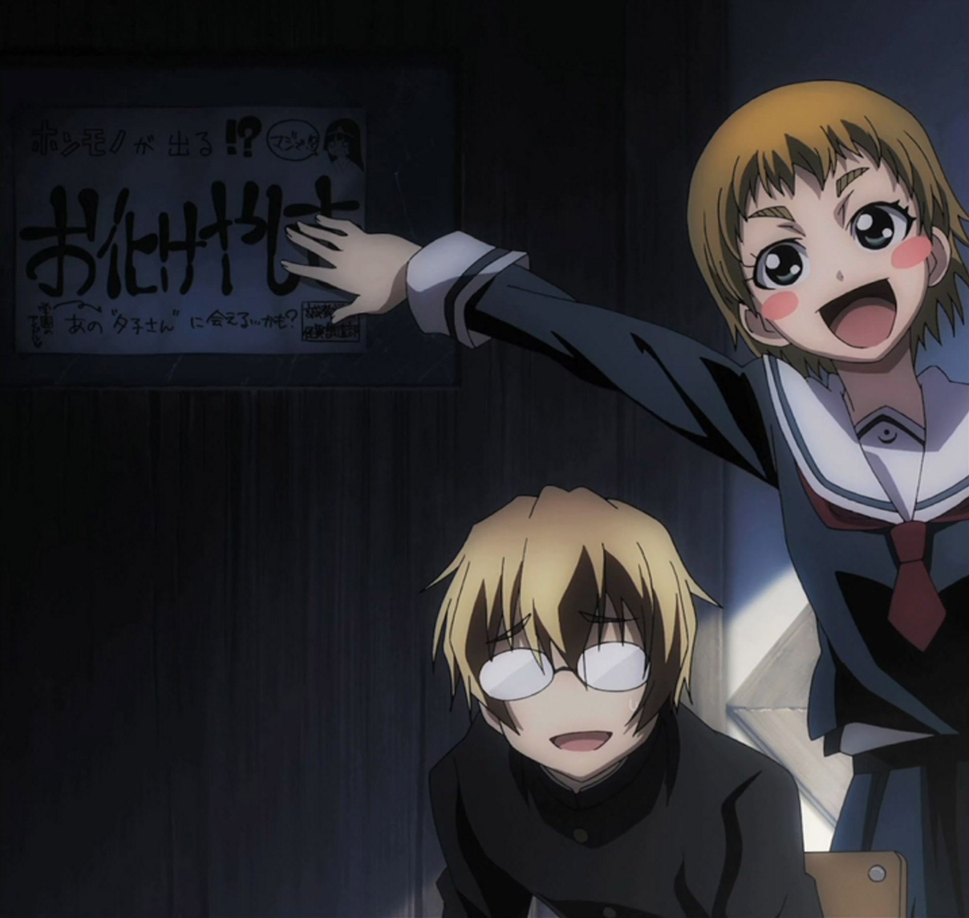 The mystery of this week was a very good one Akahito-san a rumored monster who is looking for human sacrifice his victims being students who stay too long in school. We have a new character for this episode Kirishima Yuuko (Koshimizu Ami), a girl who has been suffering because of her name and all the things its connected to. This rumor was created by her so she could end all paranormal activities and rumors surrounding the name Yuuko. Little did she know that this would lead to her fellow classmates going insane, trying to sacrifice her to the monster she created herself.