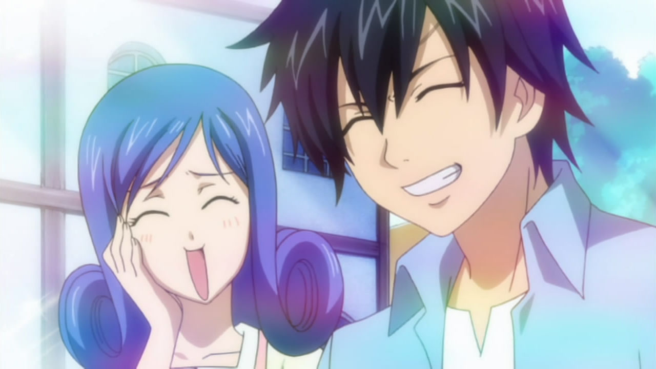 It turns out that the clock hand weve seen is just the beginning of a long journey. To complete this quest, one needs six pieces of this clock, and the clock hand was just the first one. The guild members split themselves into five groups to look for the remaining parts, and these groups, theyre definitely bringing out the romance lovers. Couples, couples, and couples there is so much shipping going on in FAIRY TAIL today! As far as I can tell, we have Juvia x Gray, Natsu x Lucy, and Gajeel x Levy one of these couples has an imaginary family, if only this was real