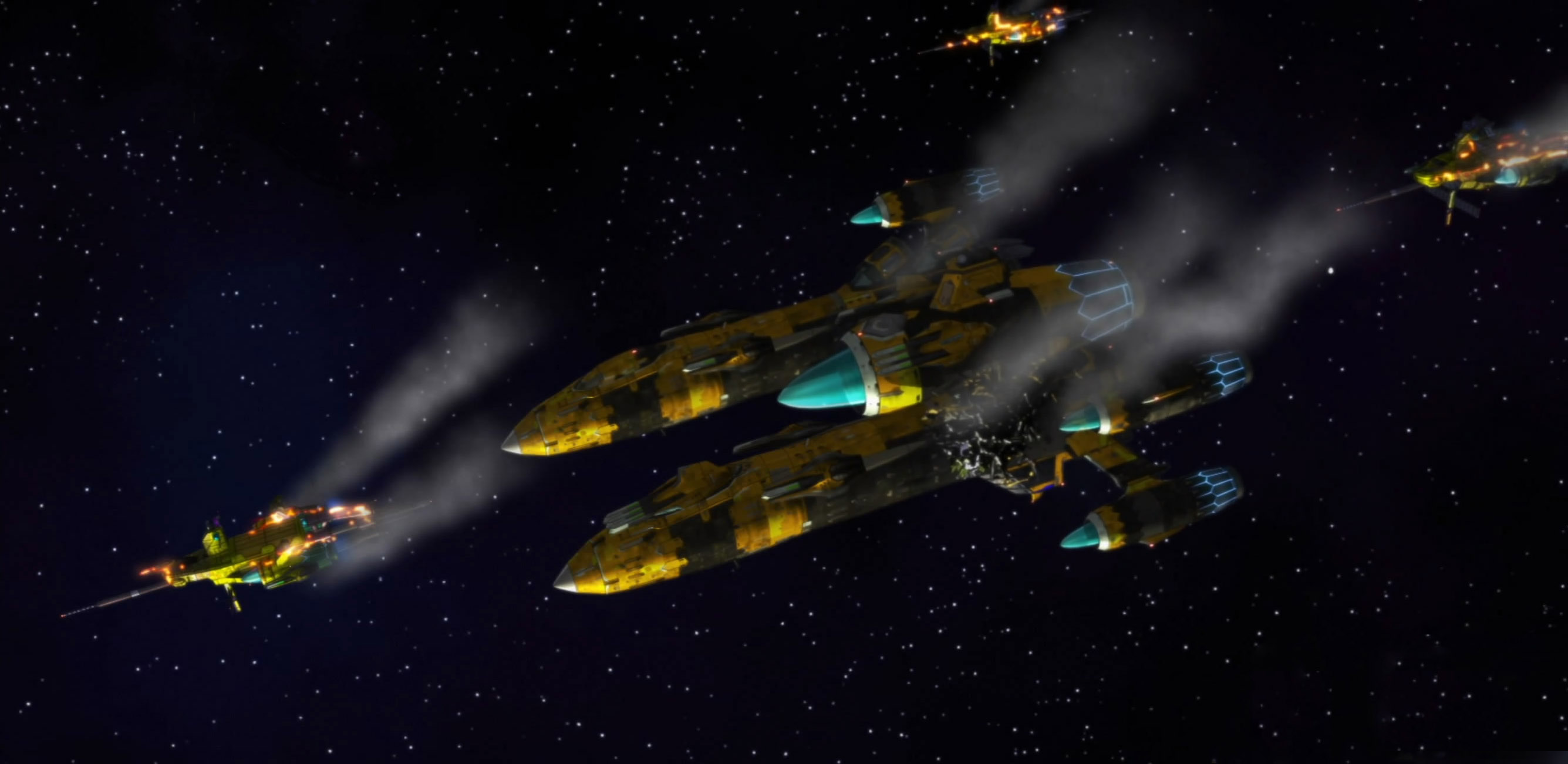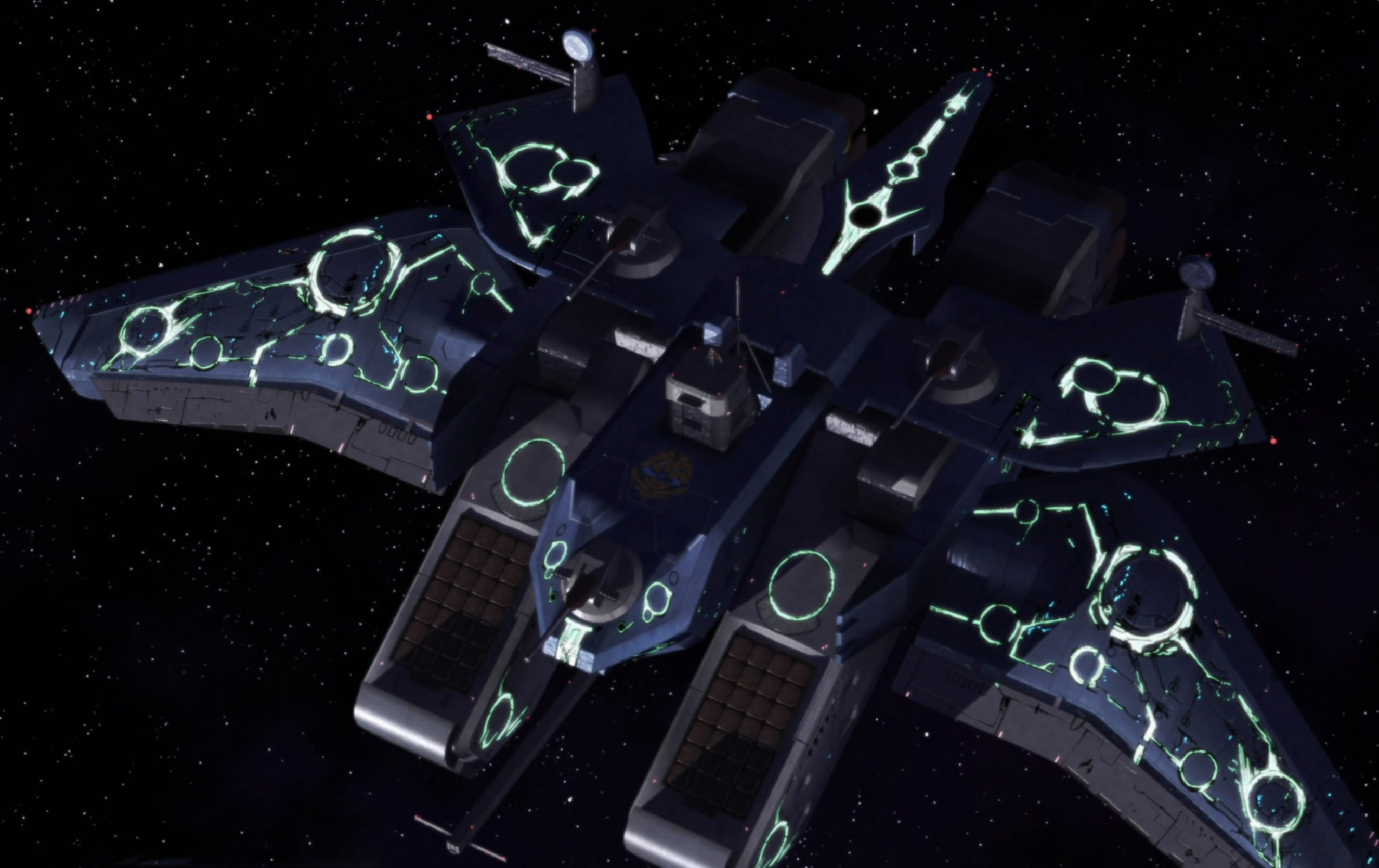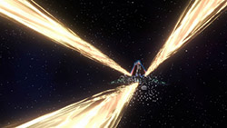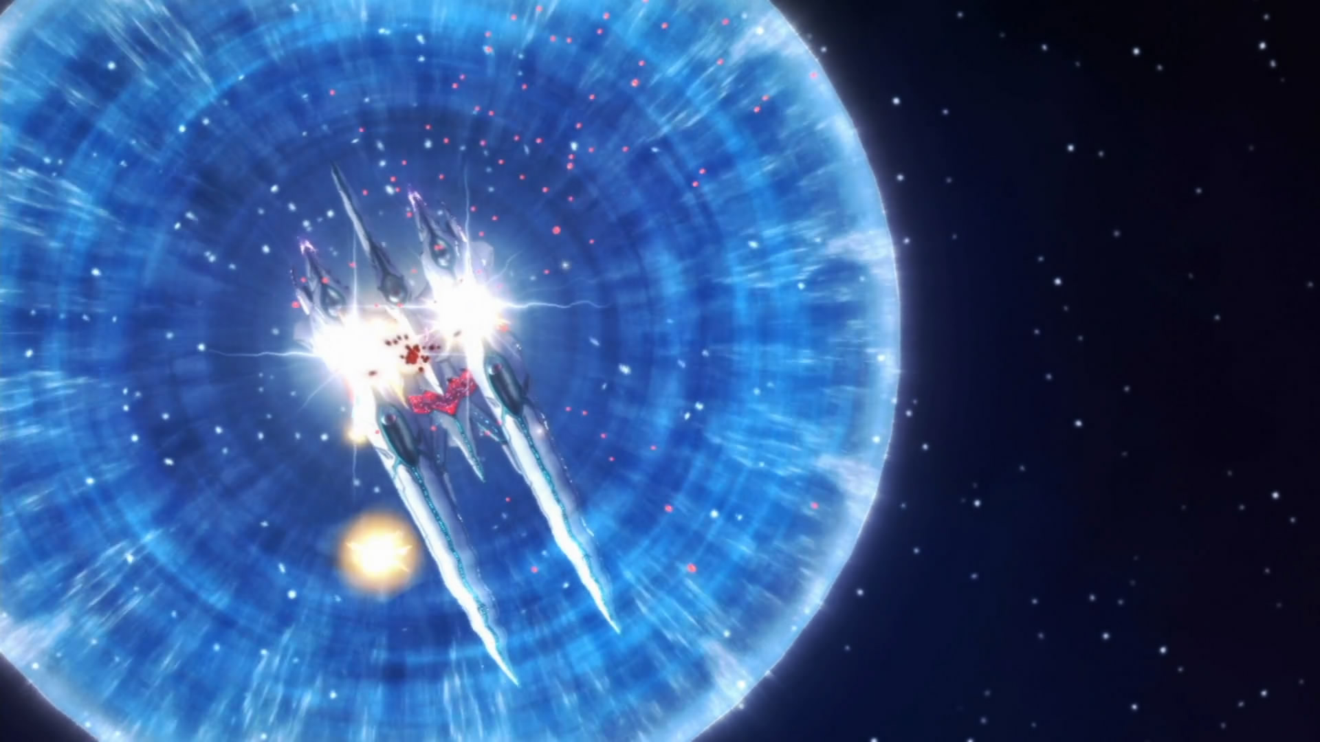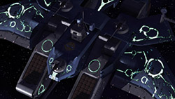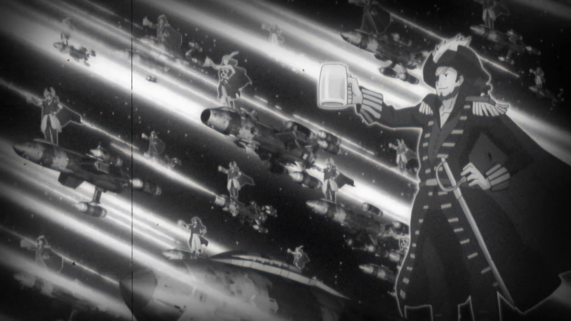 I was slightly disappointed in the beginning when the close up of the Parabellum revealed that the guy standing outside was just a hologram…it’s just less awesome than Gurren Lagann style.The sound in space explanations is definitely something I haven’t seen since Spaceship Operators. However, as much as this series tries to set up some space technology, it also throws all that out the window with the Grand Cross gravity-control zigzagging and a Galaxy-wide quantum broadcasting communicator that looks like a retro boombox.