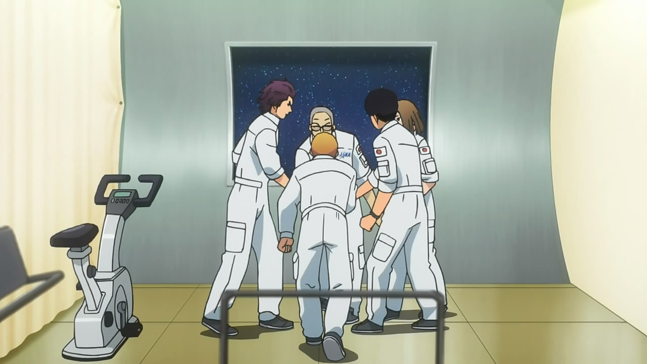 Rather than tell us outright exactly which two from Team A (and of slightly lesser importance, Team B) were chosen, the episode instead gradually wheedles out a few of those who were not selected by their teams, namely Kenji, Mutta and Furuya. Given that only one additional person will be chosen to accompany those six (according to the preview at any rate), either Kenji or Mutta will end up being left behind and Furuya certainly has next to no chance of advancing. A fair bit of time is actually spent making sure we’ll definitely feel bad for the latter when he doesn’t succeed this time – his big dreams born from such a small source (not all dreams have to be propagated by something major) and that he refused to give up on even when he realised that he couldn’t succeed under the original testing requirements contribute to this. While his refusal to be deterred regardless of the apparent impossibility was admirable, Uchuu Kyoudai shows us once again just how much of a role luck plays in everyday life – the chance he was given only came about because someone else – Baba Hiroto (Hirose Masashi) – had faced a similar situation and done something about it. Even if Furuya is left behind this time, we can rest assured that he’s unlikely to give up trying.