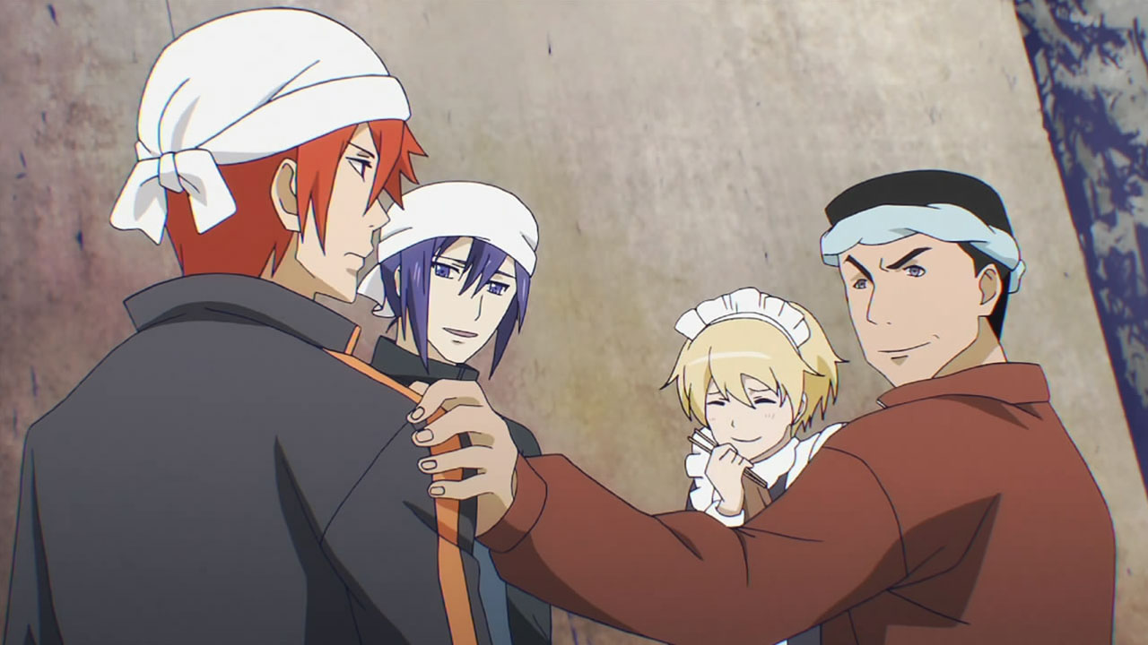 Hey Stilts, shouldn’t you be happy Machiko-sensei wanted to go to the hotel with Youko-nee? That’s another yuri pairing, now from the old members of the Jersey/Sweats Club. Too bad Youko-nee had to go to Kirius and Array’s farewell party and couldn’t join Machiko-sensei at the hotel for Christmas Eve. :DAnd lol at Hiroshi being the first one to bawl out in front of everyone. At the sight of their Master shedding some manly tears, our favorite trio of De Metrio ace pilots finally opened the floodgates themselves, and joined their Master for a tearful group hug.And last, but certainly not least, is Moid. He’s back to his scheming shenanigans, egging Dizelmine towards reigniting the war by giving him some new powers. I’m really looking forward to his explanation for his actions, and woe betide if it doesn’t satisfy Madoka, cause I’ll bet Kirius’s barnacle-encrusted Ovid that he’ll receive a Kamogawa Dynamite Bomber in the gut if he doesn’t. I’m hoping Izo or Giuvi-nii aren’t gonna kick the bucket any time soon, because judging by the preview and some of the flags they’ve raised, it seems to be turning into a distinct possibility.