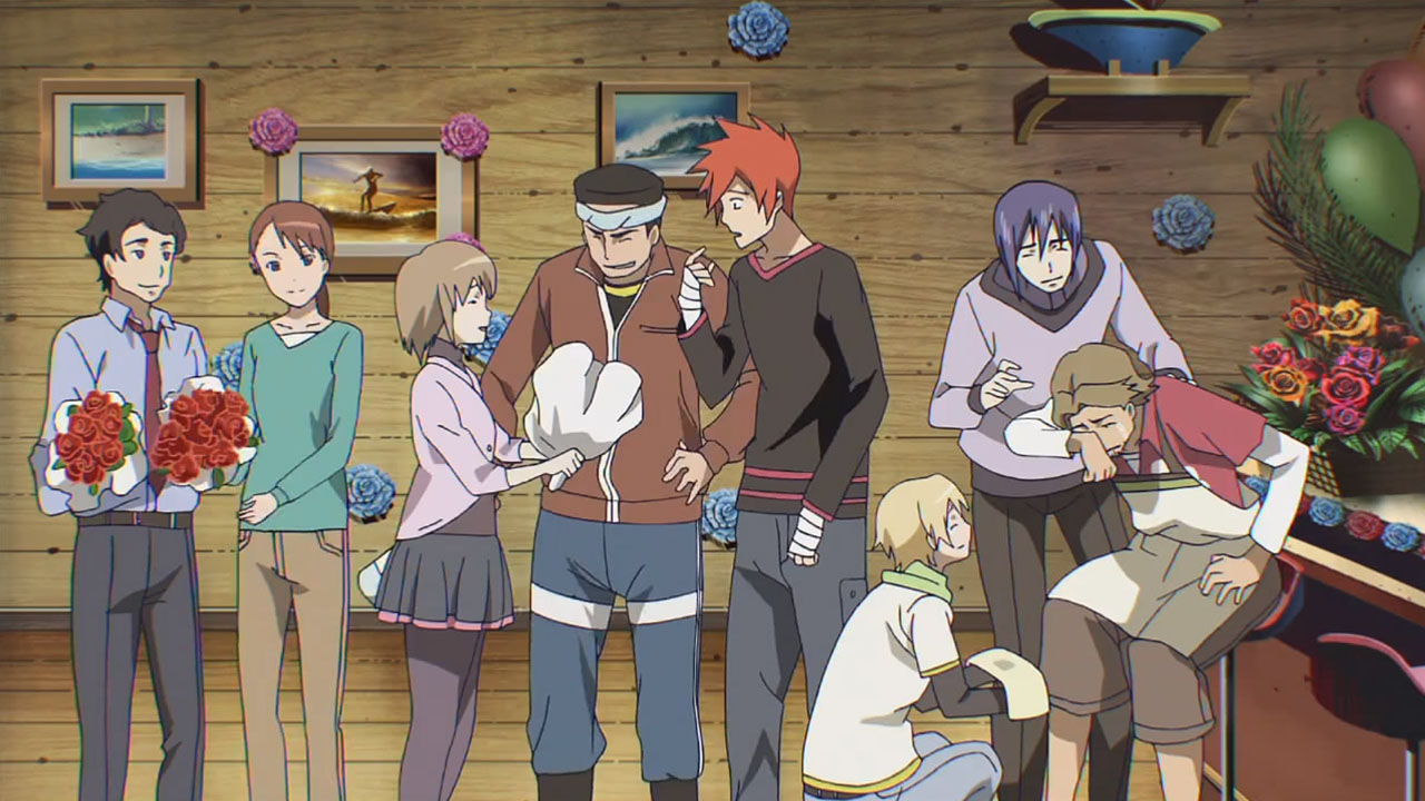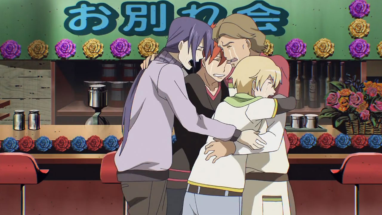 Sad partings was the realm of Array and Kirius, and everyone who came to see them off. After hearing last episode that Array would be leaving, I wasn’t in the least surprised to hear that Kirius was going as well, nor that Izo would be staying. If anyone was going to stay, Izo would be the one to hang around for a fleeting chance at seeing Yurikano again, or maybe just to ride things out until the whole situation feels well and truly over. And their parting…well, it was obvious to me as soon as Madoka said it that they would all cry at the same time, but I didn’t see Hiroshi-ojisan being one step ahead of them. Partings can be said, but there were such good feelings here, of relationships that changed each other’s lives and of friendships that will endure even across the stars. I loved it.