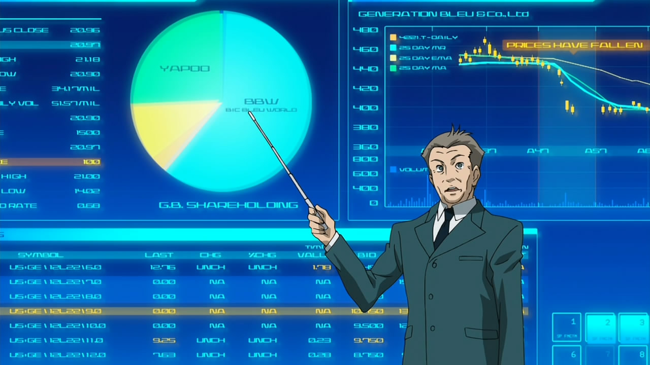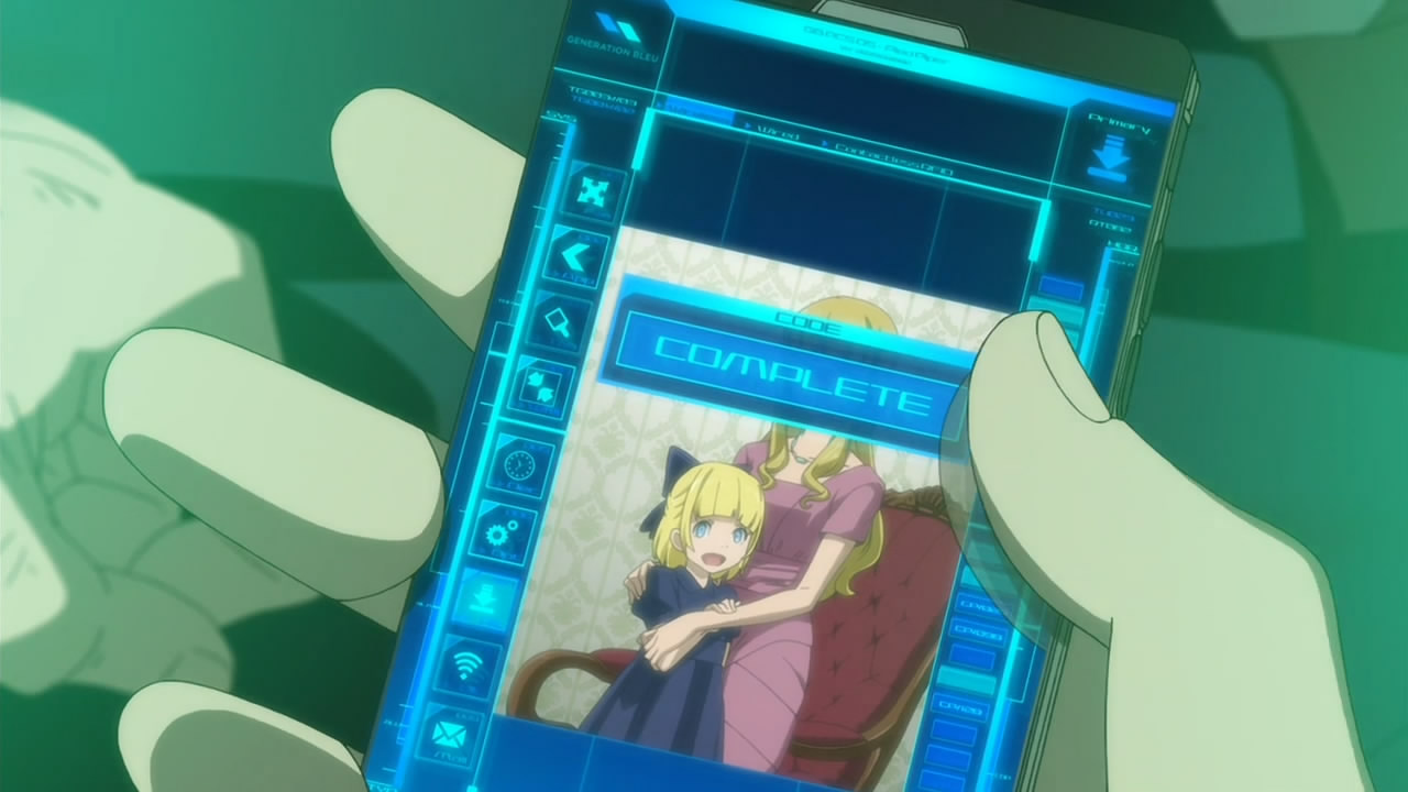 Speaking of which, much of the rest of the episode chronicles what appears to be the last hours of GenBleu, through the eyes of Elena, Fleur and Christophe, with Ao largely secondary. Big Blue World abandons GenBleu, and the first thing that happens is that their power gets cut off. Everyone is more or less in survival mode here Rebecka is system-restoring the Secret-infected Georg, and being pressed by Gazelle to decide where her loyalties lie. Stanley is gone, back to the boardroom. Christophe seems basically to be preparing for the end, and trying to make contingency plans for his daughter.