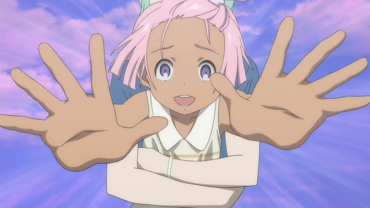 And then theres Elena. Elena is becoming more and more open about her identity. For the first time she tells Ao and Fleur that shes from another world and that she expects Ao to use his big gun to take her back there. In her mind, at least, Elena came from Eurekas world it was certainly Eureka who brought her but Im not 100% sold that shes the daughter the Eureka who visited and spent time with Ao was supposedly carrying. She might be Aos sister but Im skeptical. The hair certainly looks more like Anenomes, and theres the matter of typeTheEnd that was supposedly in GenBleus basement (along with Lillith, if Elenas Eva reference is to be believed). Elena sums up her fascination with otaku interests this way: When your life is like a manga, you can only believe in the fantastic. Its as good an explanation as any Ive heard for why she is the way she is, and I think there are still more secrets about her we havent uncovered yet.