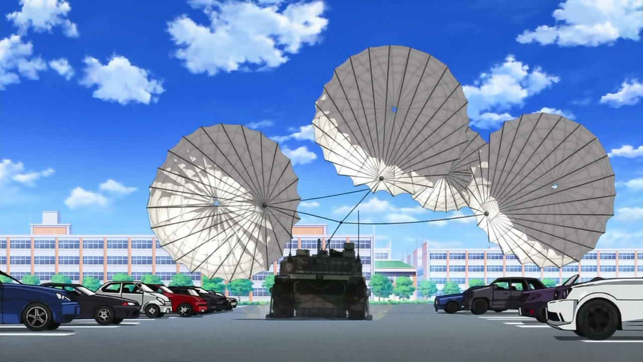 The few who complained at the lack of time spent on tanks last week certainly won’t be disappointed this week! Let the search for tanks begin! As you might expect from Mizushima Tsutomu, Girls und Panzer pulls no punches when it comes to being over the top. It’s one thing to find a rusty 38(t) hidden away in the woods, but rappelling down the side of a cliff to find a Type-89 I-GO? I don’t even think I want to know how it ended up in that cave! Of course, if this was the extent of the brilliant craziness, it would hardly be deserving of that reputation. But it doesn’t end there – oh no, it most certainly doesn’t. How does the tank instructor, Chouno Ami (Shiina Hekiru), make her entrance? Why, by dropping out of the back of a carrier aircraft and proceeding to flatten the principal’s car in a Type 10 of course!