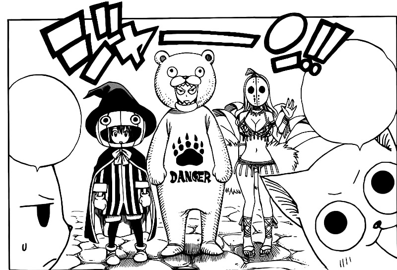 As Natsu’s team rushes towards the castle, Happy suggests that everyone wear mascot costumes so they won’t be seen. Mira, Wendy, and Natsu dress up in various weird costumes.