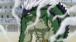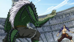 Elfman has truly developed through this series, he is the man! He has not only grown in size, but strength as well, and he seems far more intelligent than during the last time I saw him in a fight. The lizard form was very clever, but I am a bit surprised that his form wasnt as detailed as it was in the manga (image requested by my friend, Shadiic). But thats not really something that bothers me because this fight was nothing but amazing. There were several new tracks playing in the background and they all enhanced the intensiveness of the battle. I have been saying this over and over again, but we need that fourth soundtrack now! Anyway, the soundtrack alone was not the reason why the battle amazed me as much as it did. It was the frenzy of two strong and honest combatants in a fair fight, trying to protect something. In Bacchus case, it was his guilds name, while Elfman fought to protect his sisters from the drunkard. After all the cheating and low points, it was truly refreshing to see FAIRY TAIL back in the game, and they earned their place, unlike another guild. It was also quite nice to see that the two fighters are good people, and are respected by their fellow teammates. I love companionship! Oh, did I ever mention that I really like Evergreen and Elfmans relationship? They totally have something going on, Im sure of it!