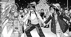 But in anime, I found something else, something that I liked far more. It’s not better, by any means! Just something that had more allure to the hopeless romantic that I am. Rather than a time of crass commercialization (and family), Christmas in Japan is a time for crass commercialization (and love). Love! Though an ideal that is undoubtedly rarely realized in real life, I always enjoy the Christmas date-o. I could list off ones I especially enjoyed…so I think I will. Hatsukoi Limited (d’aaaw, that outfit), Toradora! (that song, that bear), School Rumble (that sled, those fish missiles!), Asobi ni Iku Yo! (those kisses, that space elevator!) and of course, Amagami SS (that entire series). Yet if I had to pick one, it was the second Christmas in the Love Hina manga that was the first one to really draw me in.