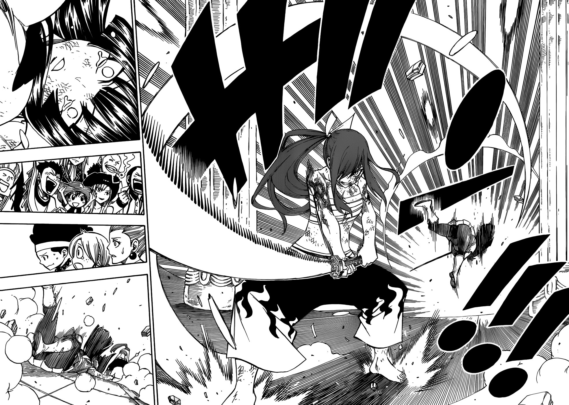 To everyone who is saying “where was the calamity from Kagura unsheathing her sword?”Did no one notice pg.5? She cut past the magic barrier surrounding the Arena and effectively cut entire city in half, that was probably the strongest attack we have seen in the Grand Magical Games yet. Natsu’s ultimate technique just succeeded in blowing up the barrier, Kagura’s just cut through the barrier, the arena, and the entire city. If she got to swing that thing around, everyone would probably be dead for miles around.Erza also didn’t block the attack, she deflected it, hence the destruction it caused.