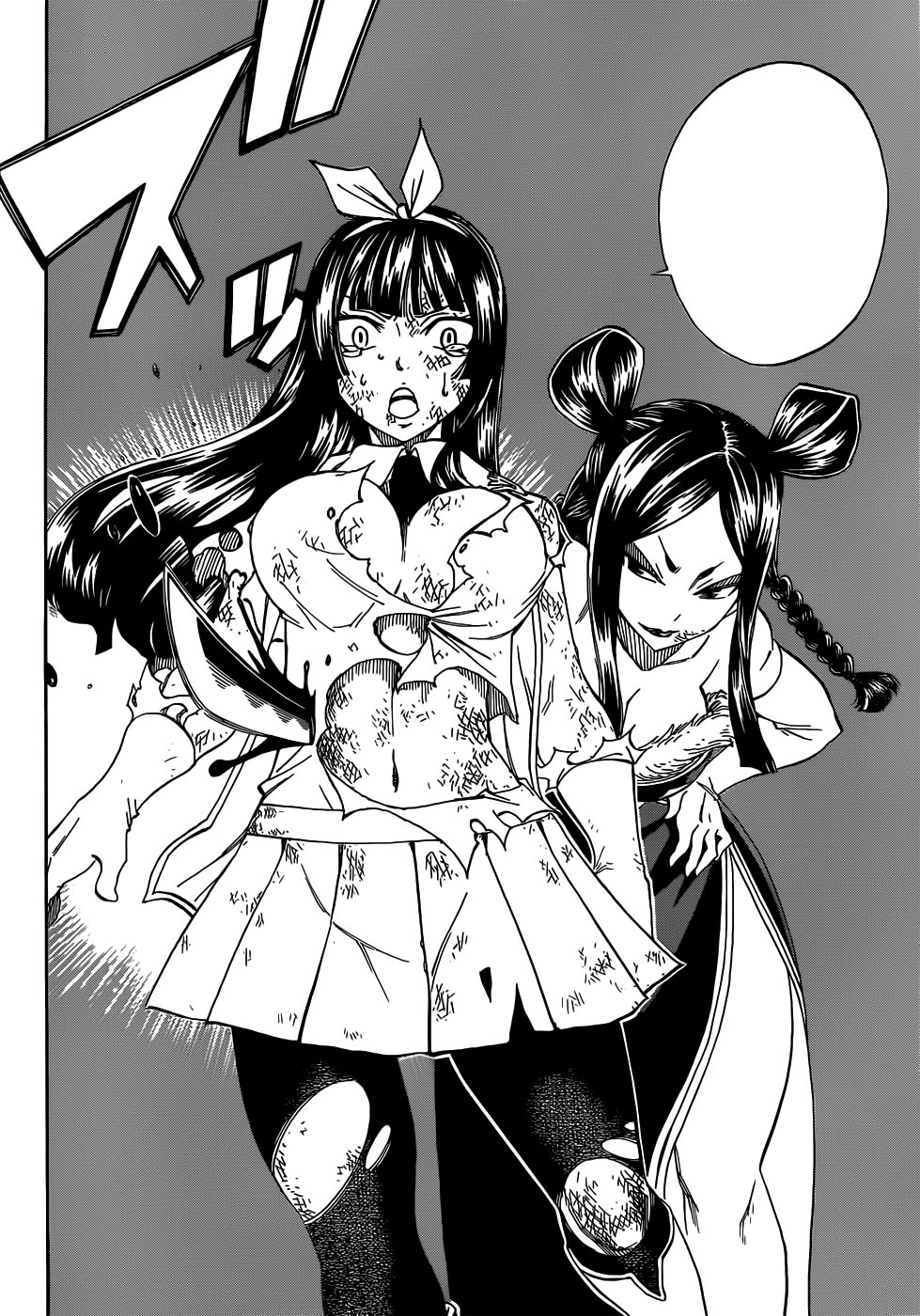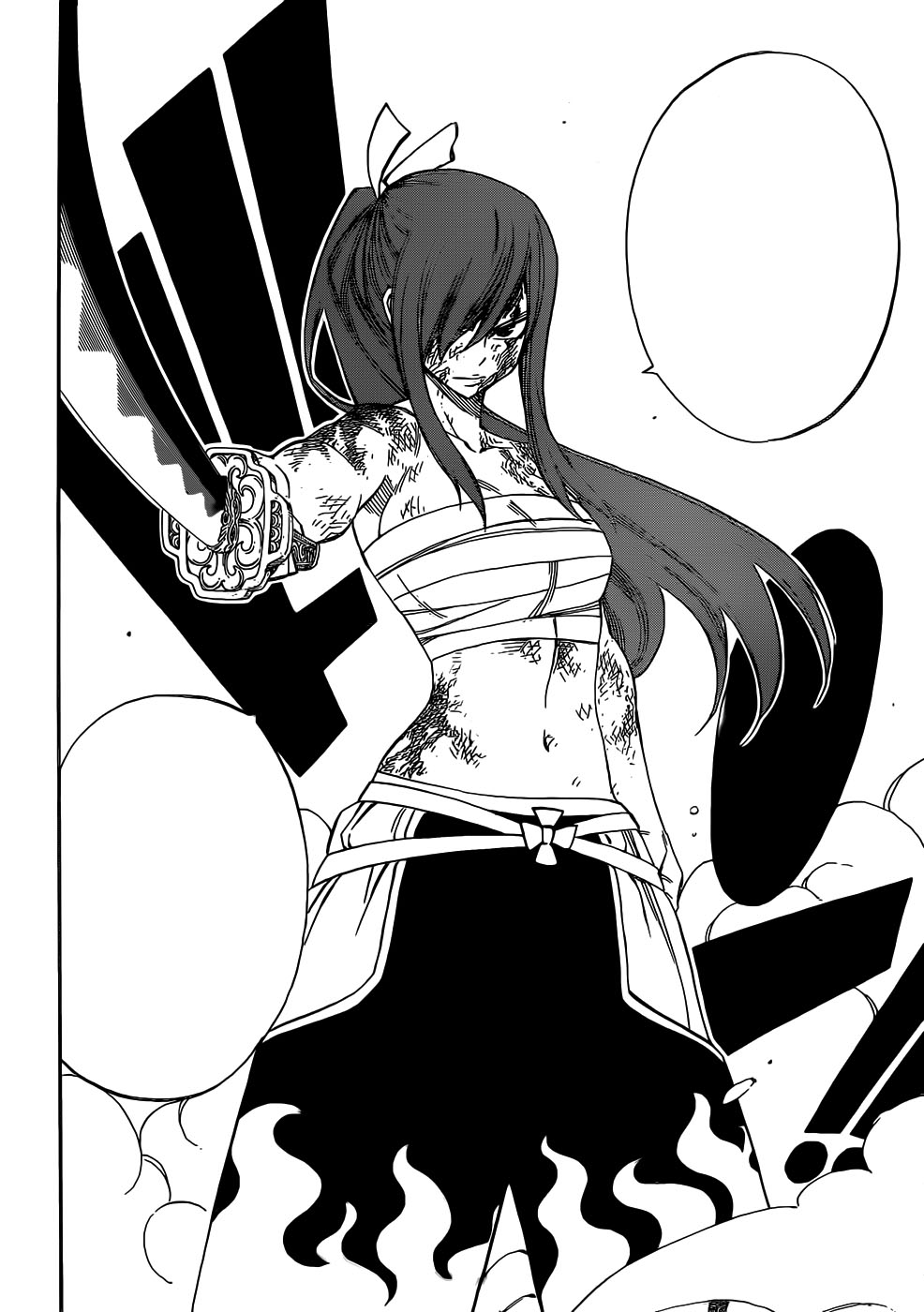 Yep… Erza is at an disadvantage, so I don’t think she’s going to have her usual “for my nakama, I will beat you for sure” powers. Instead, seeing how Minerva didn’t really stab Kagura anywhere vital, I hope she will get back up and team up with her. Because, seriously, there has to be more to her unsheathed sword than whatever the hell happened in the beginning of this chapter.In any case, omgholyshit loli Kagura is the cutest thing in the world.