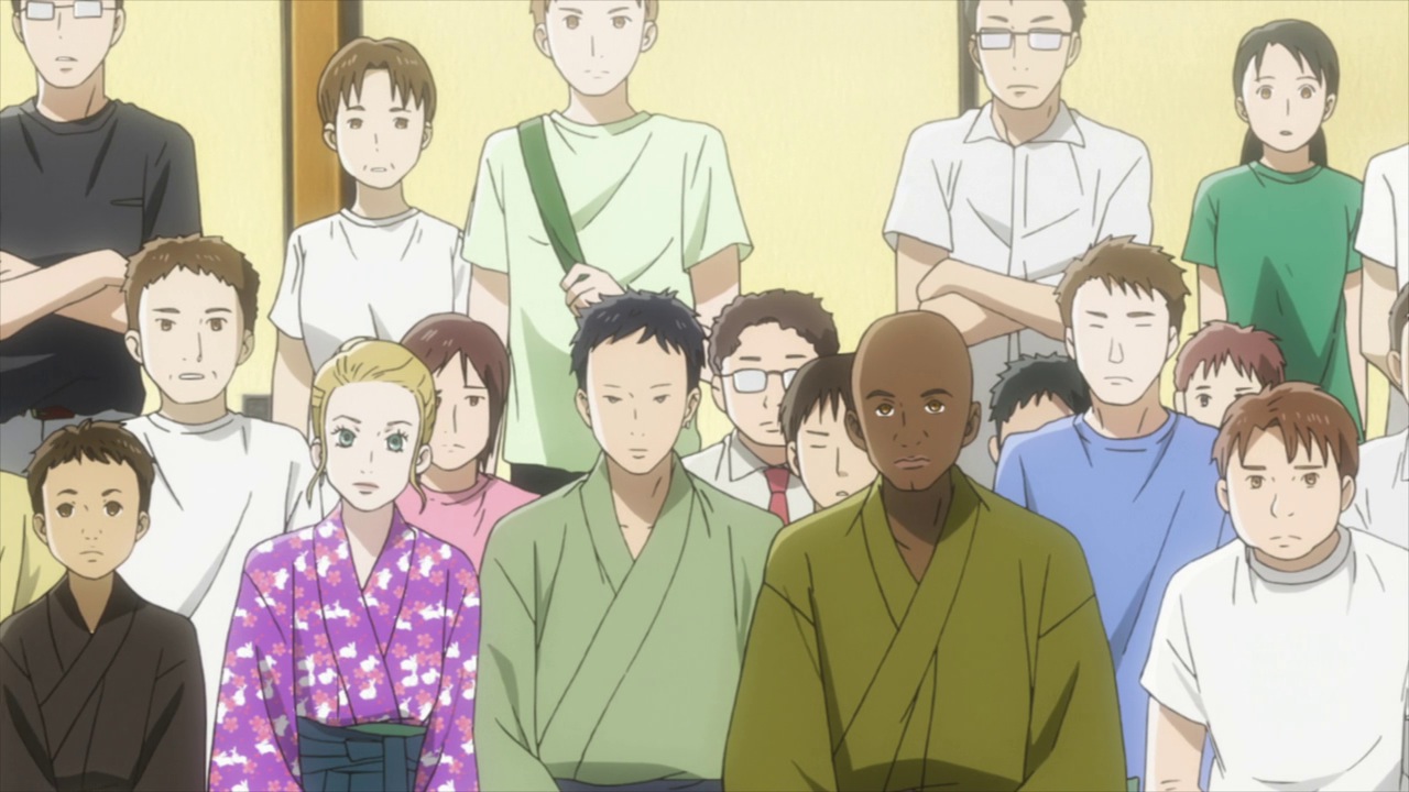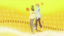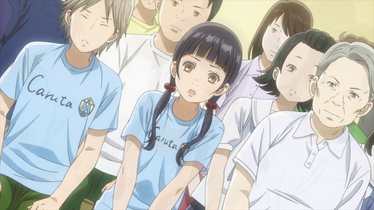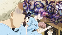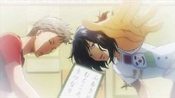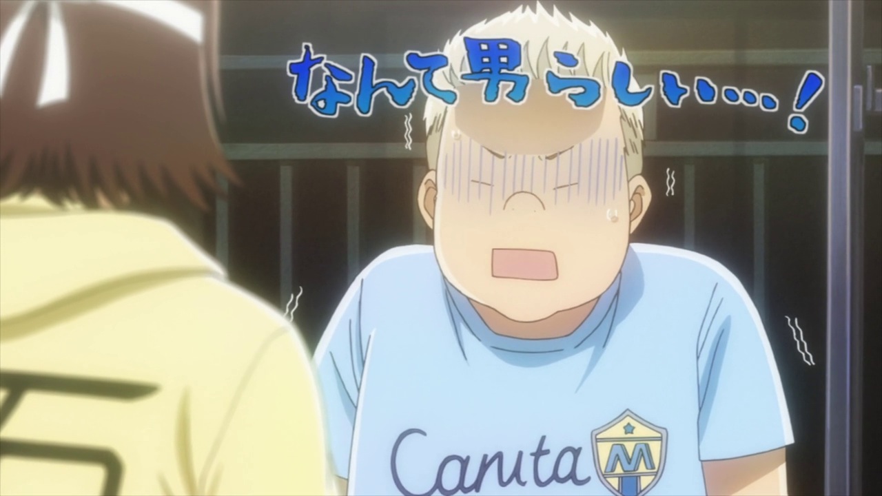The paparazzi exist to point out “the gap in [Megumu’s] behavior.” They do their annoying swoon every time she pretends something she doesn’t actually feel–for example, when she offers her teammates headbands, which the coach things shows her team spirit, but which they know really reflects a selfish wish not to stand out.All that’s so that you notice when the camera boys don’t swoon–namely, at the end of the episode, when Megumu is firing up her team. We get from that the understanding that there is no gap now, that Megumu herself really wants to win, and isn’t just playing since everyone wants and expects her to.It’s a nice payoff. That may not make the trio less annoying, maybe, but there’s a definite reason they are there.