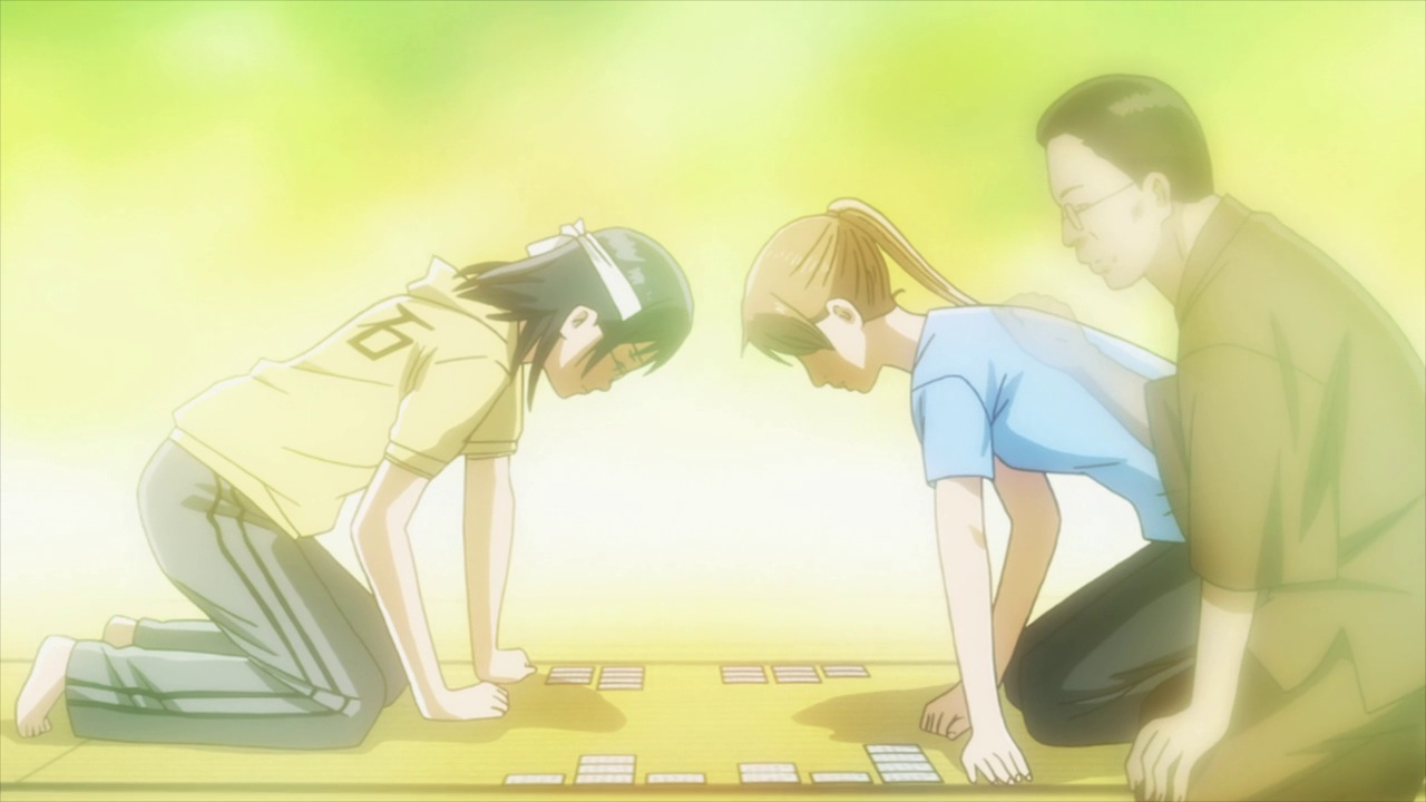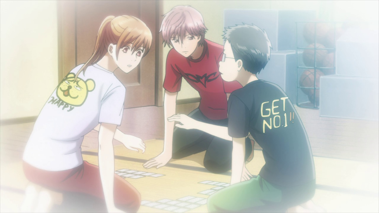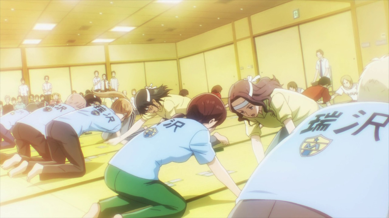 Girls und Panzer managed quite a few, most notably without the ridiculous cutaways and flashbacks and everyone-finishes-each-others-sentences-in-their-heads. Let’s get this match finished soon please, the “revelations” from Chihaya and Megumu aren’t worth practically dumping the rest of the main cast for. Not read the manga, but I predict:Mizusawa winning should be a given, so I’ll say Chihaya/Taichi/Tsutomu to win. Why the latter two? It’s a quick and cheap way to make them relevant again …
