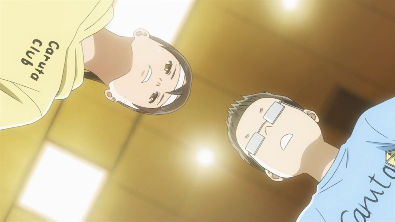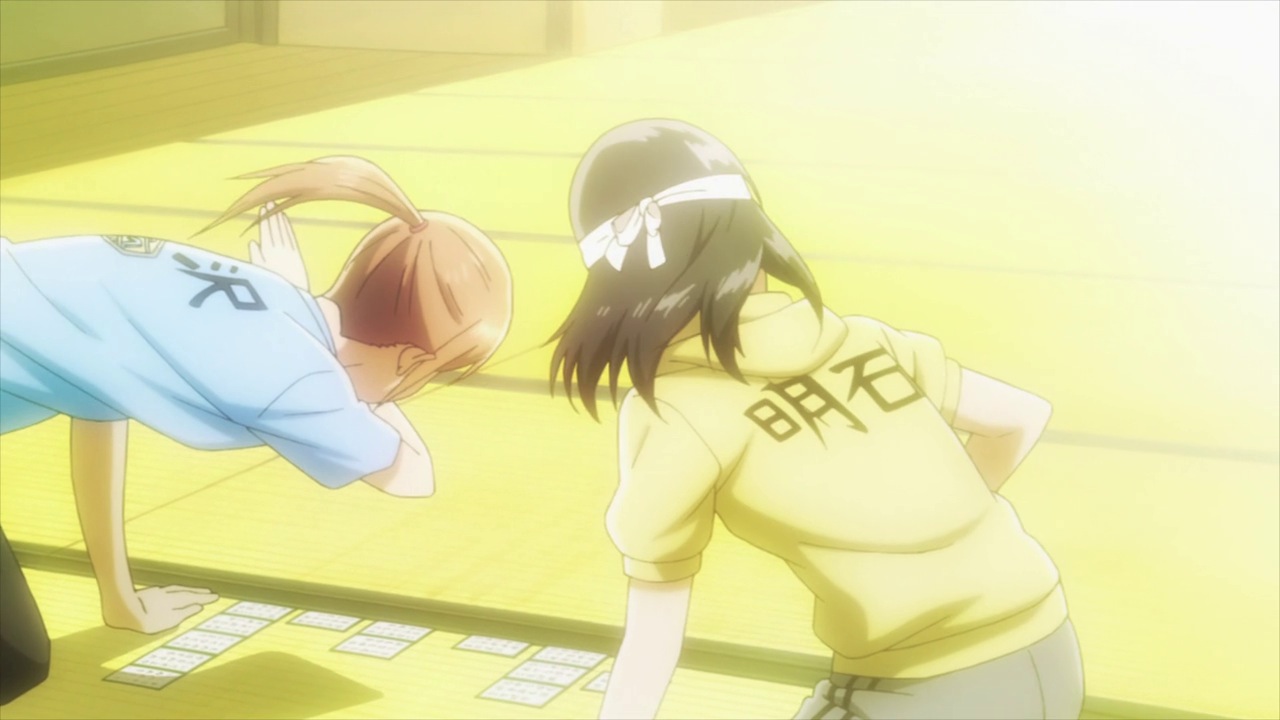 My goodness, is this the same series I saw last week? I just watched a complete 180! First of all, this episode was a complete blast. Megumu left me with a bitter taste in my mouth of utter annoyance and disrespect for the card game last week. I just wanted Chihaya to crush her this week. But Megumus comments about not caring about being queen, only piss me off more. Players have motives for why they play Karuta, many have goals and things they want to accomplish out of this game; it wasnt until the end of the episode that Megumu stated that she was doing it for her friends. A selfless deed from an arrogant brat? I wasnt expecting that. My bitterness didnt left after that realization about her, it just bothered me instead. What a waste of a talent. was all I could think of. While many spend countless hours training to be better, faster, as what we have seen from our very own cast you can see that they want to accomplish something, not entirely in the World of Karuta, but to better themselves as humans beings. When Porky stated that he didnt wish to denied his love for Karuta any longer by subtitling it with Tennis, it made me happy. When Desk-kun stated that he wanted to be better as a person and that Karuta made him see that, it made me happy. When Kana-chan stated boldly about her love and appreciation for the poems, it made me happy. I thought Megumus statement about playing Karuta just because she is repaying back the help her friends gave her didnt. To me it seem like (in chronological order from beginning of the episode to end) I dont actually want to do this, but I feel like I must because of you guys. I dont want to let you down. Its not like I care about being Queen, but this is fun right? Thanks for sporting my headbands, its not a sportsmanship thing, I just didnt want to look silly wearing one alone. And since Im competing I might as well win! And even if I dont want to be Queen, that doesnt mean I will let you challenge her! I cant back up a character or feel anything for them when theyre presenting themselves that way.