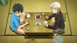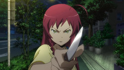 While the humor in Sadao’s (“apologize to all the Sadaos in Japan!”) situation is in watching him and Ashiya acclimatize to everyday life (enthusiastically so), the humor in Emi’s is watching her fit human life to a T and being totally miserable and lonely about it behind her serious faade. Though she claims to be stalking Sadao for surveillance and for the sake of making sure he doesn’t step out of line, her real motivation in doing so is in simple camaraderie; the Demon Lord and his retainer are simply the only people in Tokyo that she can relate to, and she’s desperate not to let them out of her sight. Her various approaches (“Let me in! I’ll kick down the door! Is that what you want?!”) don’t have much of an effect on Maou, who realizes from the moment she threatens him with a 100 yen knife that she’s not much of a threat without her magic. Their banter, however, is brilliant, and it’s not always crystal clear just who’s playing the tsukkomi role in their relationship. Though Emilia has more common sense on how to live off a part-time wage, Maou certainly has a clearer goal than she does (ridiculous as it is, I suppose world conquest must begin somewhere), and he’s not all that fooled by her sudden intrusions into his life. As it is, at some point the fact that these two are sworn enemies is forgotten by everyone but Ashiya, and Maou seems to take some pity on her when she keeps showing up.