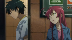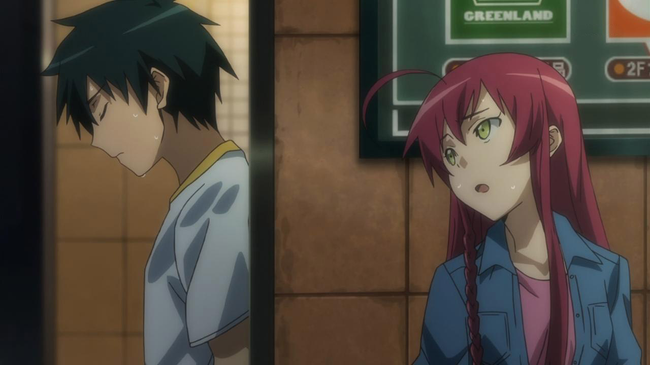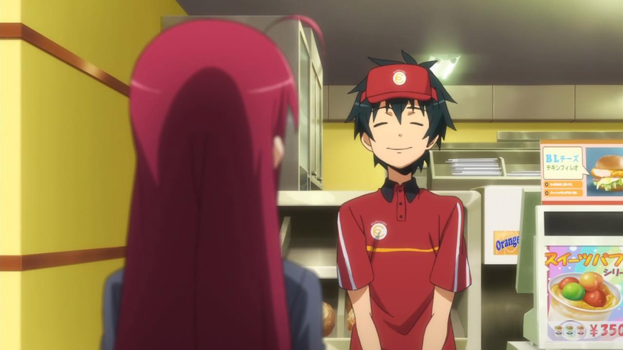 >] “the only drawbacks I can think of is that for one it makes for more complicated and difficult writing for the author and if the audience has become more attached to one character theres a chance the changes in character dynamics might be taken negatively(emphasize on theres a chance not necessarily always).”Can’t rightly deny the possibility, but I don’t see Hataraku as being very susceptible to that. An underlying brilliance of the story lies in the dual inclusion of Maou and Emi’s roles as hard working citizens and their supernatural counterparts of Demon Lord and Hero. And while we’re obviously focused on the former, the latter maintains itself as something of a faraway fantasy at the moment; and for anyone can remember what it’s like to be a kid… really, how can you NOT relate with that?That being said, you take that together with Maou and Emi’s current roles as two likable, yet hard working individuals… again, something that your average viewer is going to relate to quite well, and I find it more than a bit difficult to swallow that you’re going to come away liking one that much more than the other.In fact, if you think about it, it’s specifically because of how inseparable Maou and Emi are due to their former roles as the Demon Lord and Hero that they can only function as well as they are as a team.