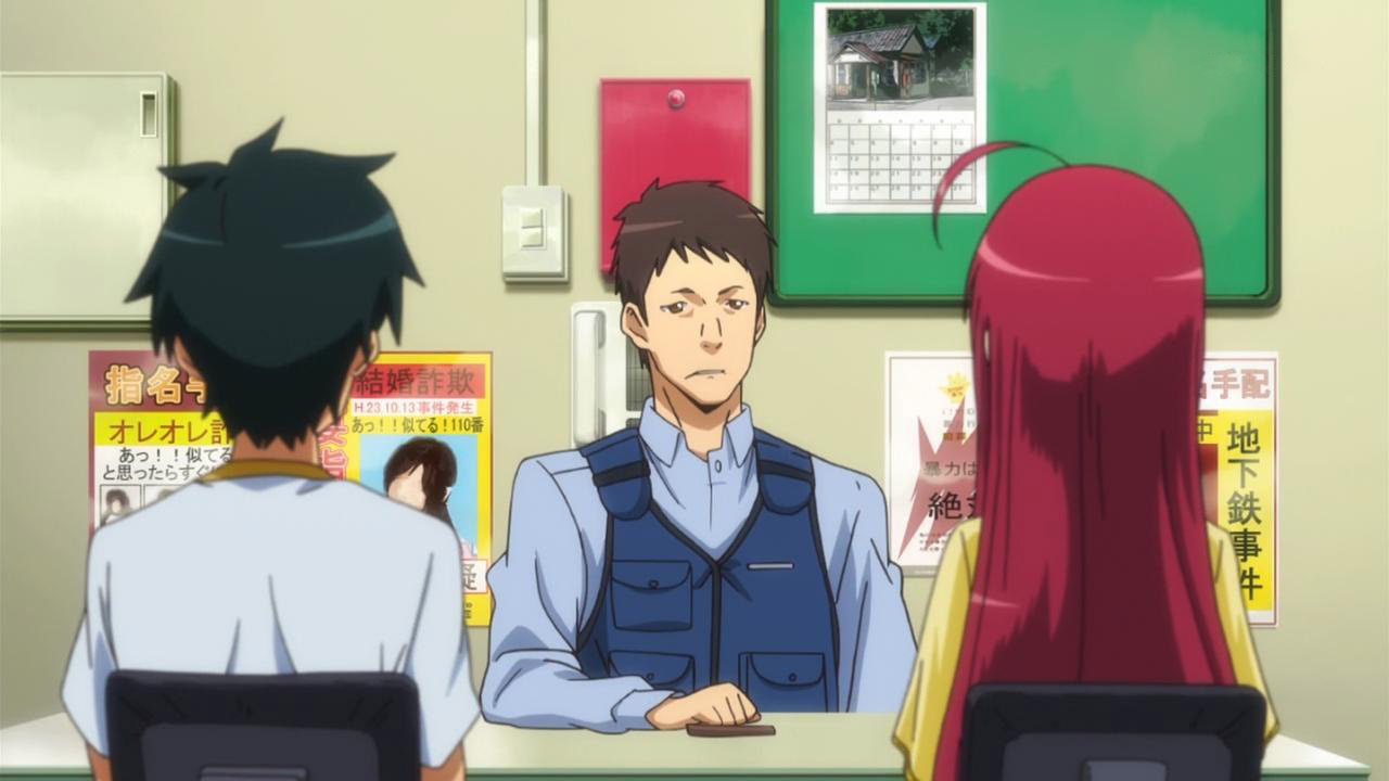 Alsiel actually did the most sensible thing to do when you’re getting threatened: lock your doors. I lost it when Yusa Emi broke down crying when they wouldn’t let her in(great performance by Hikasa Yoko). I felt sorry for her but at the same time she just sounded so cute. I can’t believe the cop just dismissed an attempted stabbing as simply a lover’s quarrel and let them off, but hey it’s a comedy. Normally, I think that would have earned Emi some jail time, and a permanent mark on her record. Also, for someone who doesn’t want to break rules, and honestly works his way up the employment ladder, it’s funny how Maou’s moral alignment is still evil and I don’t see that changing anytime soon, at least that’s what I gathered from his evening chat with Emi. You’d think living in the modern times would’ve softened him up, but no Maou made it clear that he’s finishing what he started in Ente Isla.