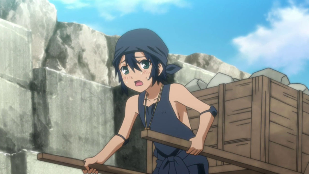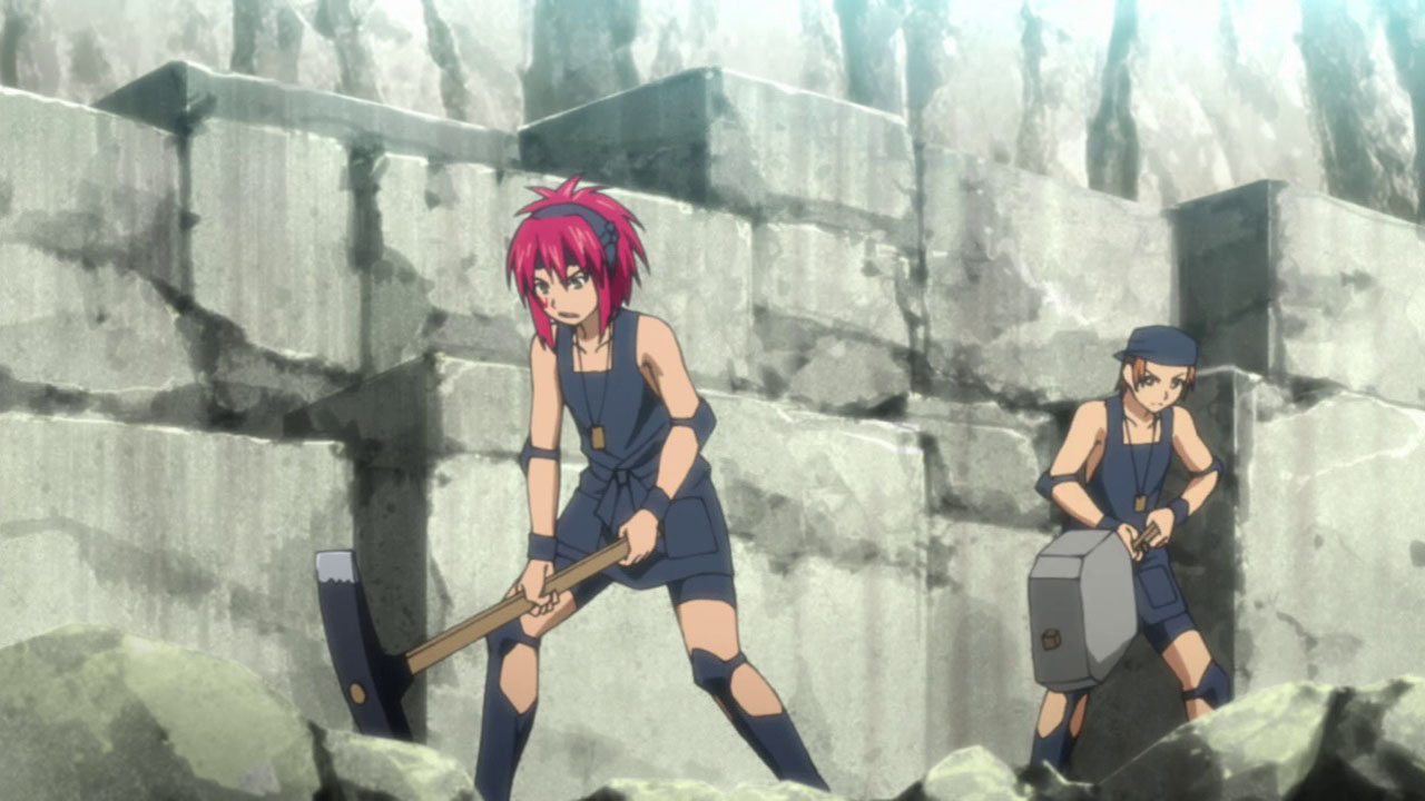And there, I think, Yasuda-sensei has managed to do pretty well. Things are quite different in the gleaming city of Suzukura in the anime version, though we still have Zokusho Hiroko guiding Hinohara’s party into the city as they don’t have the money to pay the exorbitant entrance tax. Though Hiroko is posing as a mid-level bureaucrat named Suehiro it’s clear he has an unnatural interest in Hinohara and his party, something they’re nowhere near as suspicious of as they should be. Kannagi, though, knows something is amiss – and Hiroko certainly knows who he is. As Suehiro does his spying/research for Yorunami, the others go straight to work – there’s always work in Suzukura – the boys in a quarry and Kotoha in a textile factory.
