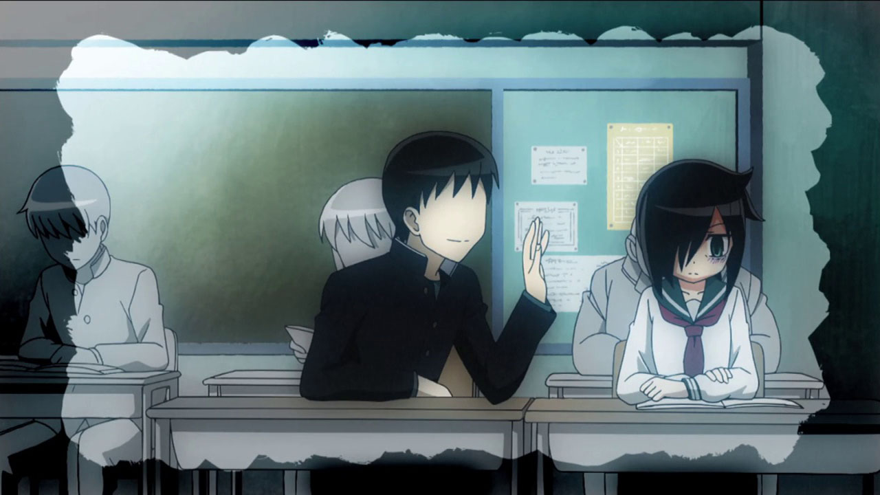 Watamote is very much the world as seen through the eyes of Kuroki Tomoko (Izumi Kitta). It’s a scary, claustrophobic place, in which most of the people have no faces (they’re just not important enough to Tomoko for her to notice). Tomoko is, simply put, one of the biggest losers you’ll ever see. She not only has no friends, but hasn’t had a conversation with anyone in her high school for three months. She’s addicted to otome games and because of her dexterity with virtual bishounen had convenced herself that high school would be her great blossoming, building on the six glorious times a boy spoke to her in middle school. She has to blackmail her little brother Tomoki (Nakamura Yuuichi) by threatening suicide in order to force him to converse with her for practice. In short – Tomoko may not be a hikikomori, but she may as well be for all her lack of social interaction.