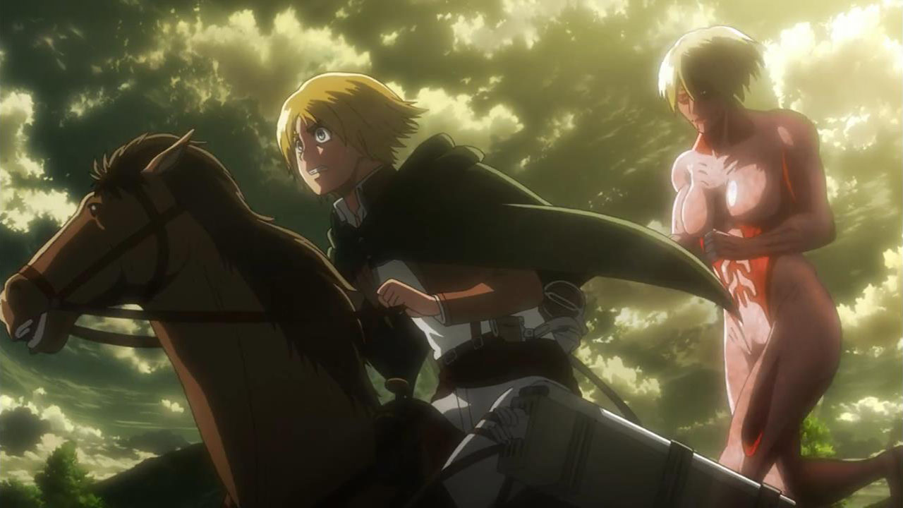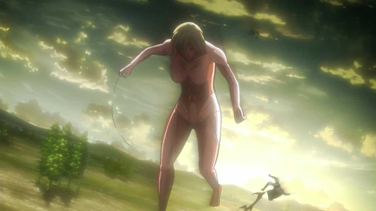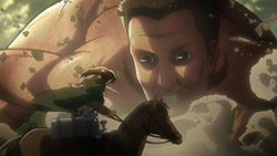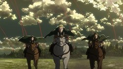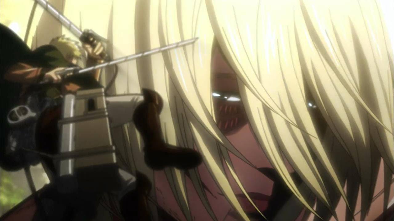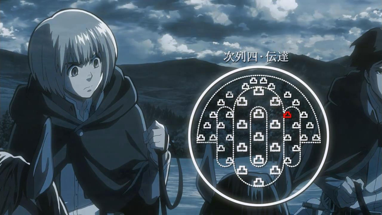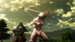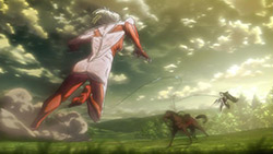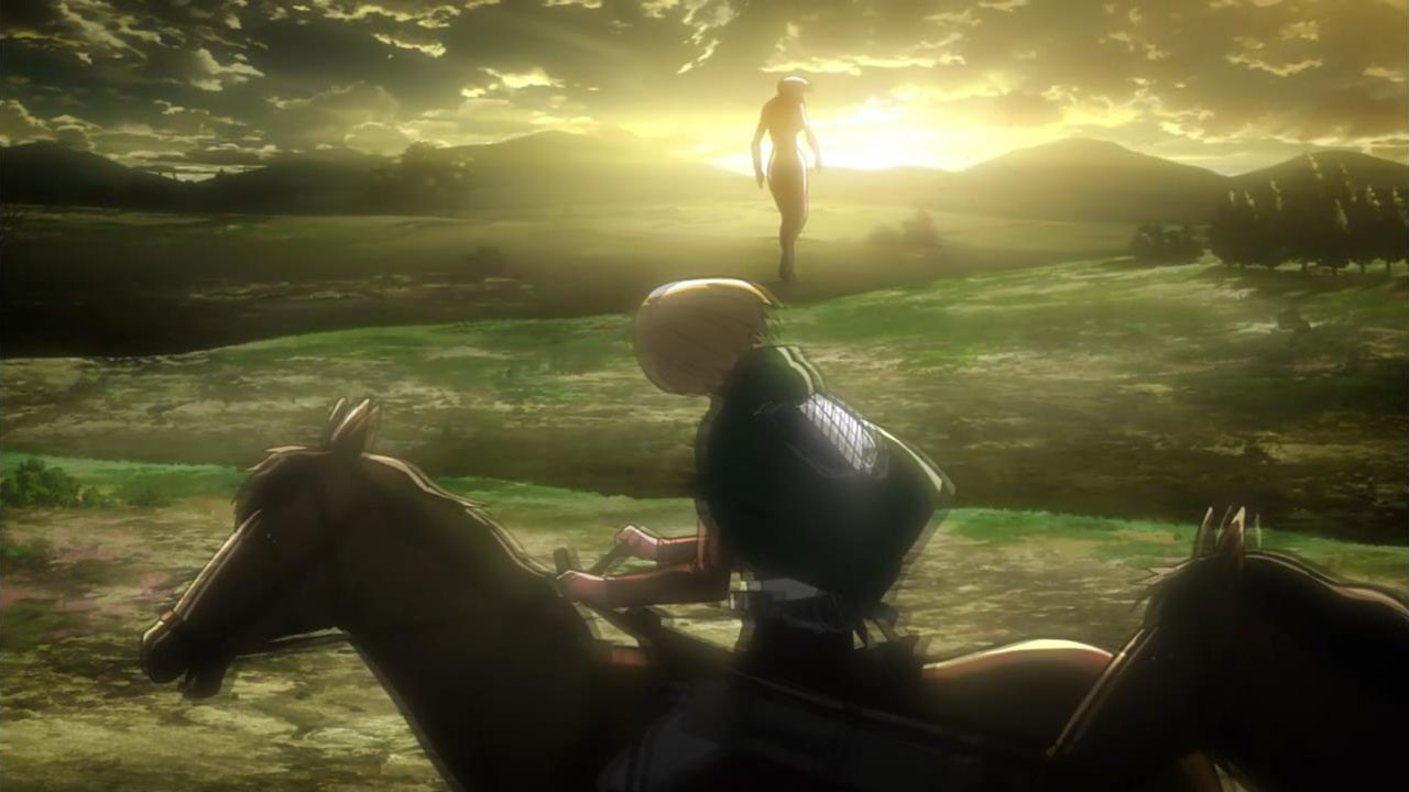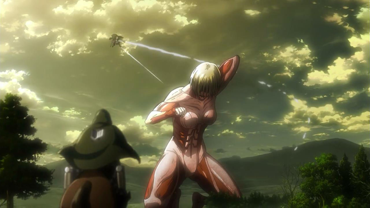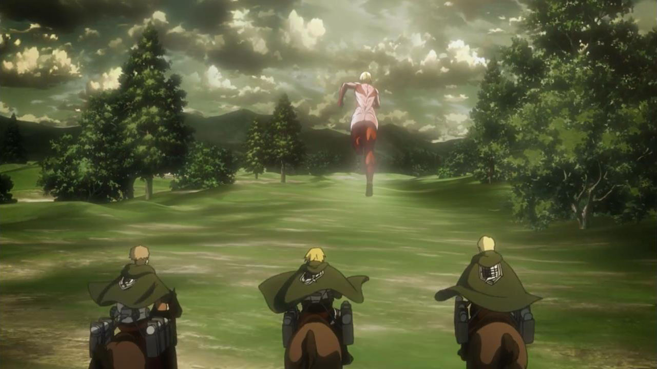 I feel like a step in Armin’s thinking was omitted? Because “the female titan is intelligent”, he concluded that “the female titan is a human like the colossal and armored titans”. He doesn’t know that the colossal and armored titans are humans, and the only evidence he has for concluding that is Eren, who is essentially anecdotal evidence. Idk, something about his logic really bothered me, since he’s supposed to be level-headed… He’s probably right though.Also, while I suppose the titans are sometimes given silly faces or weird running patterns to make them more creepy, I can’t take them seriously sometimes. The aberrant one in this episode made me want to giggle at how silly its gait was. Great episode otherwise. Watching the recon squad maneuver on a flat expanse got my adrenaline pumping and the animation was especially spectacular this week. Seeing the formation diagrams composite-ed on the still shots of characters, and the whole transitional “camera” work between those frames, was refreshing and imo executed really well.