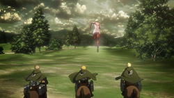 Generally, the episode starts off innocently enough with its great exposition of military tactics (the point is to avoid confrontation) and formations (that spectacular semi-circle)giving a military buff such as myself quite the treat to say the least. It’s a pity that all of that goes down the drain in the blink of an eye though, as a female Titan arrives to crash the party along with dozens of her minions. And it just goes to show that even the best tactics and formations have a weakness, and that’s the inability to combat something that exceeds virtually all parameters of your anticipated plan.